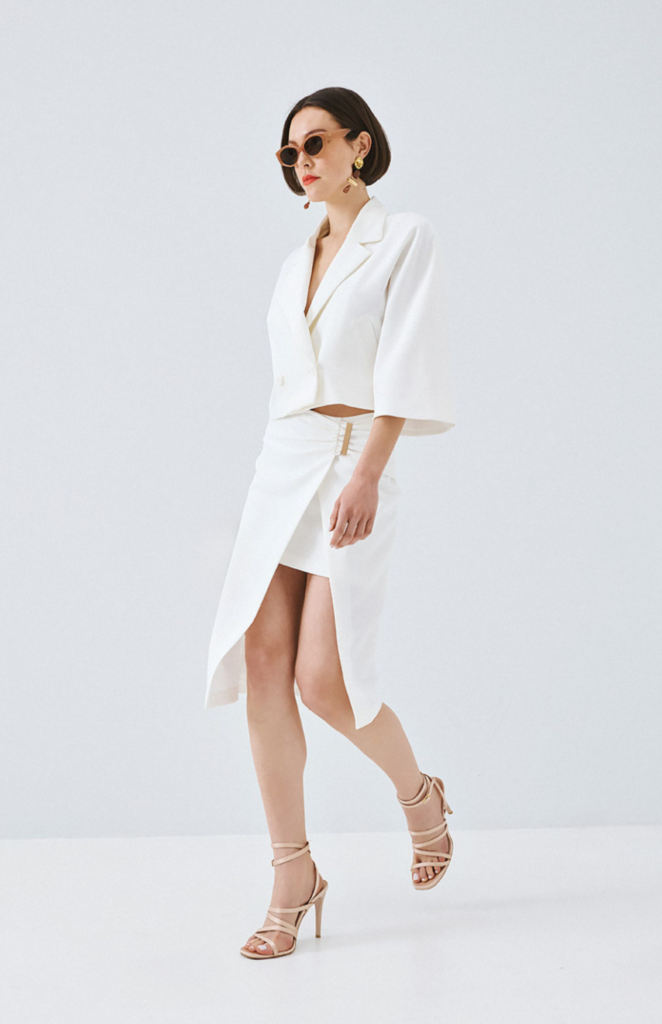 Yanina White Ruched Drapping Mini Skirt