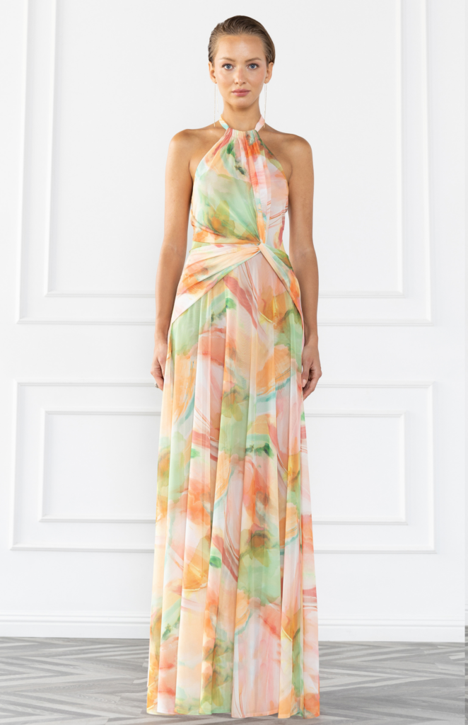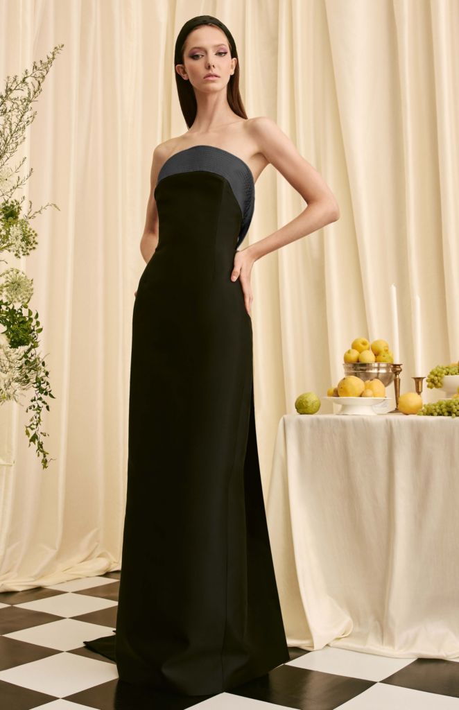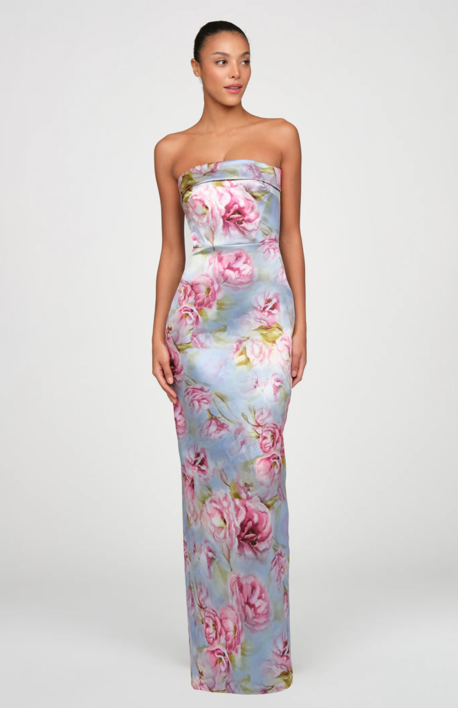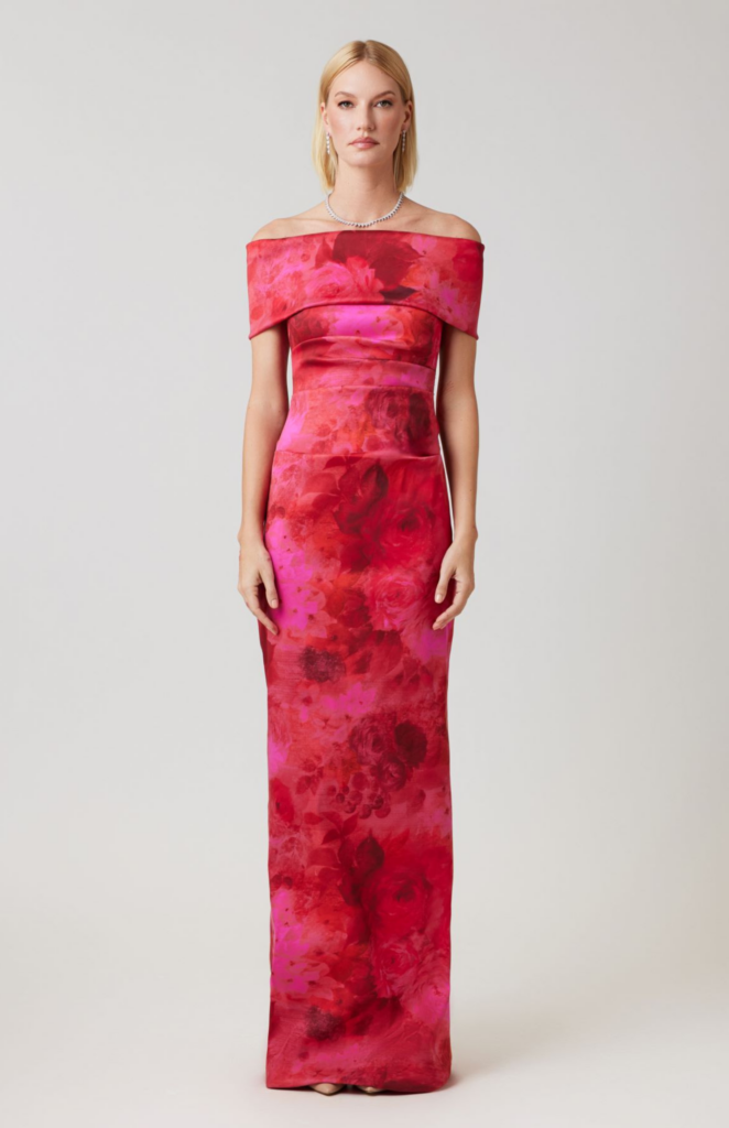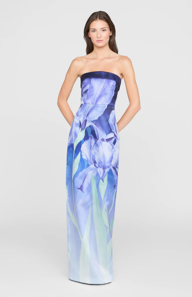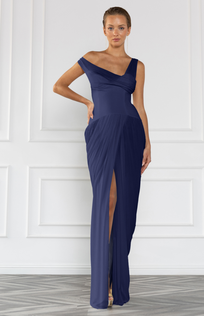 Dalton Contrast Off-Shoulder Gown in mystic blue