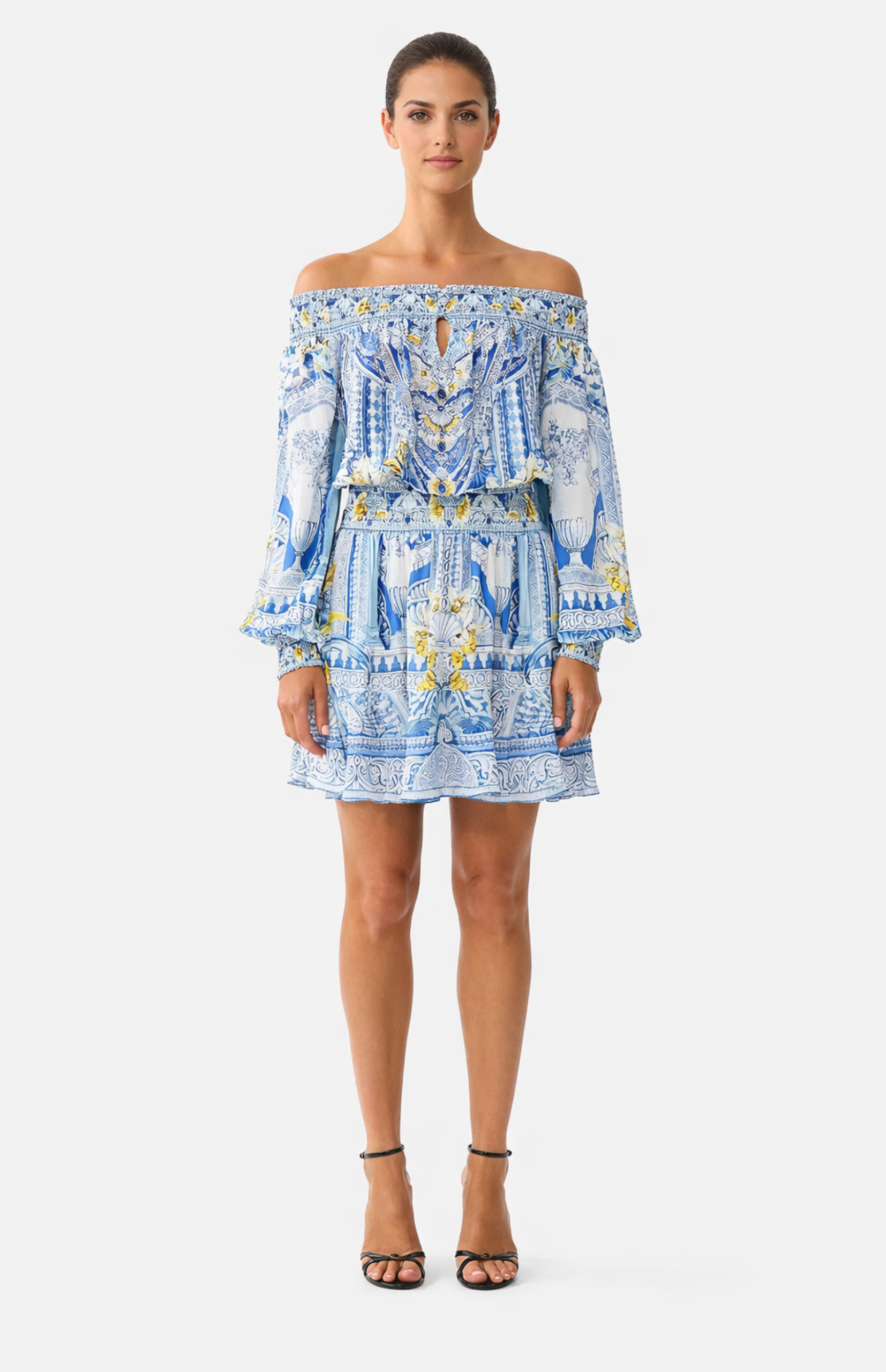 The Aalyssa Off Shoulder Short Dress is a handcrafted silhouette designed by our in-house artisans. Conceived in an exclusive limited edition print, our off the shoulder silk mini dress features a shirred waistband, neckline and cuffs for an adjustable, cinched fit. Feminine blouson sleeves and a flared hemline add soft volume, while crystal embellishments add subtle sparkle.
