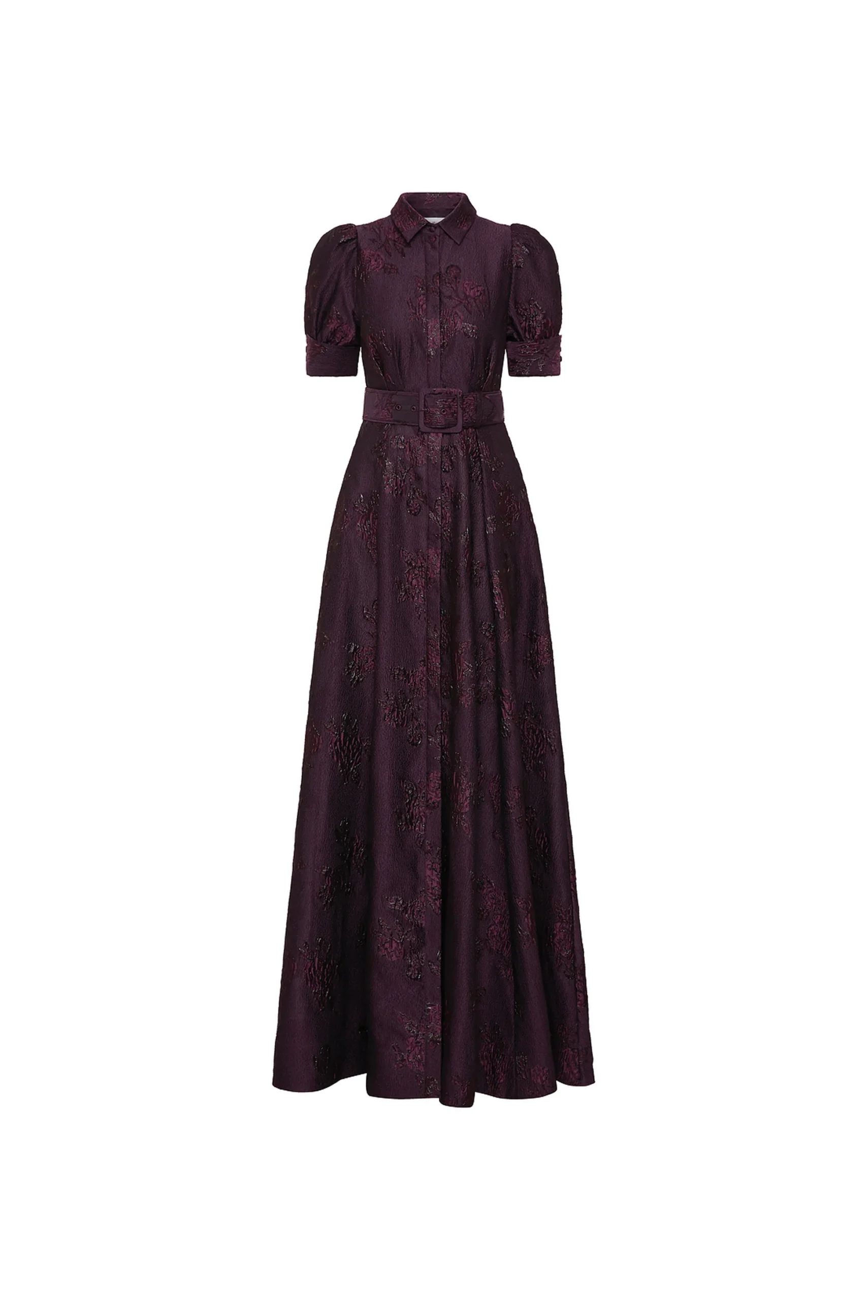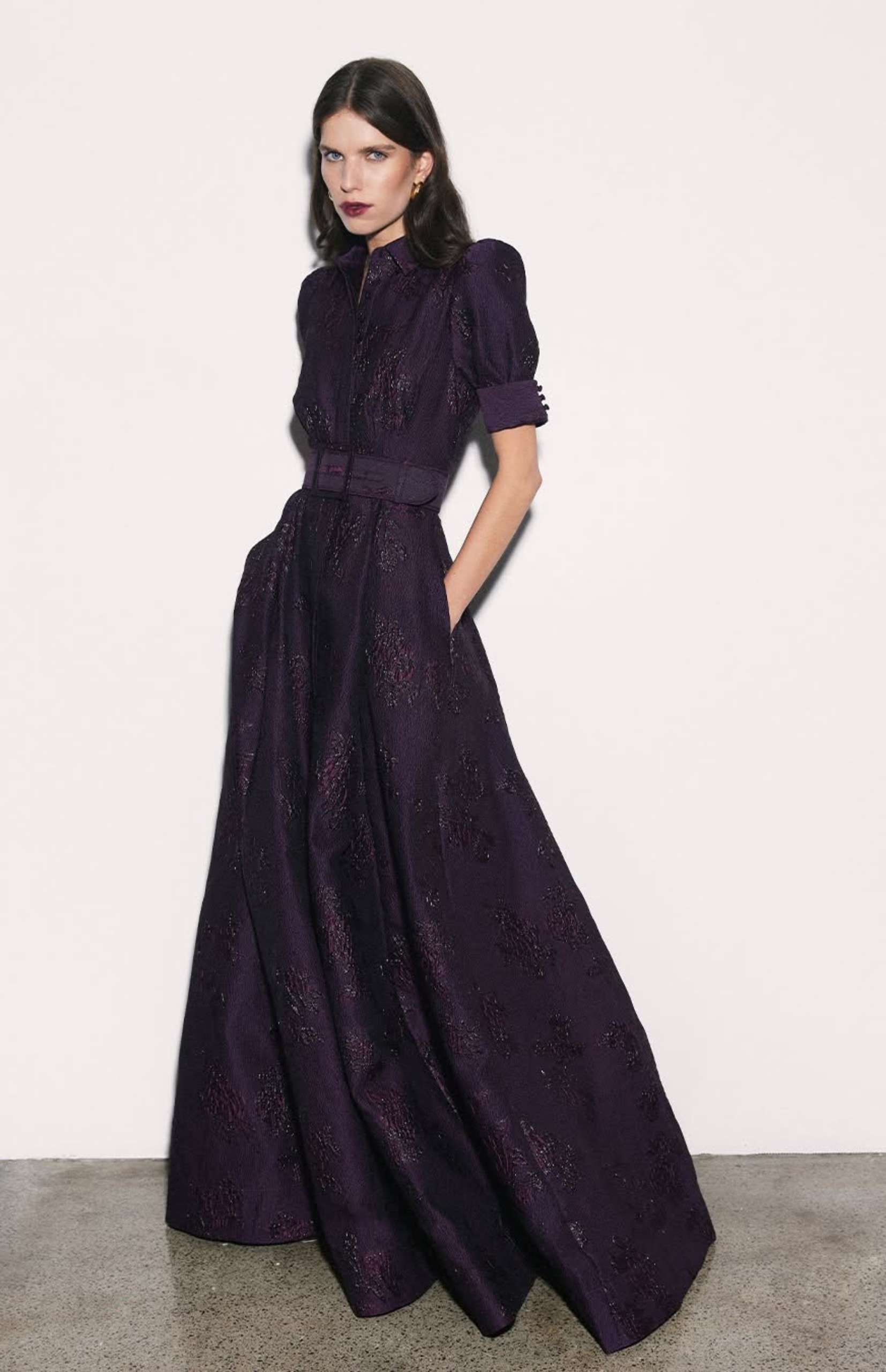 One shoulder a-line gown with flower appliques.