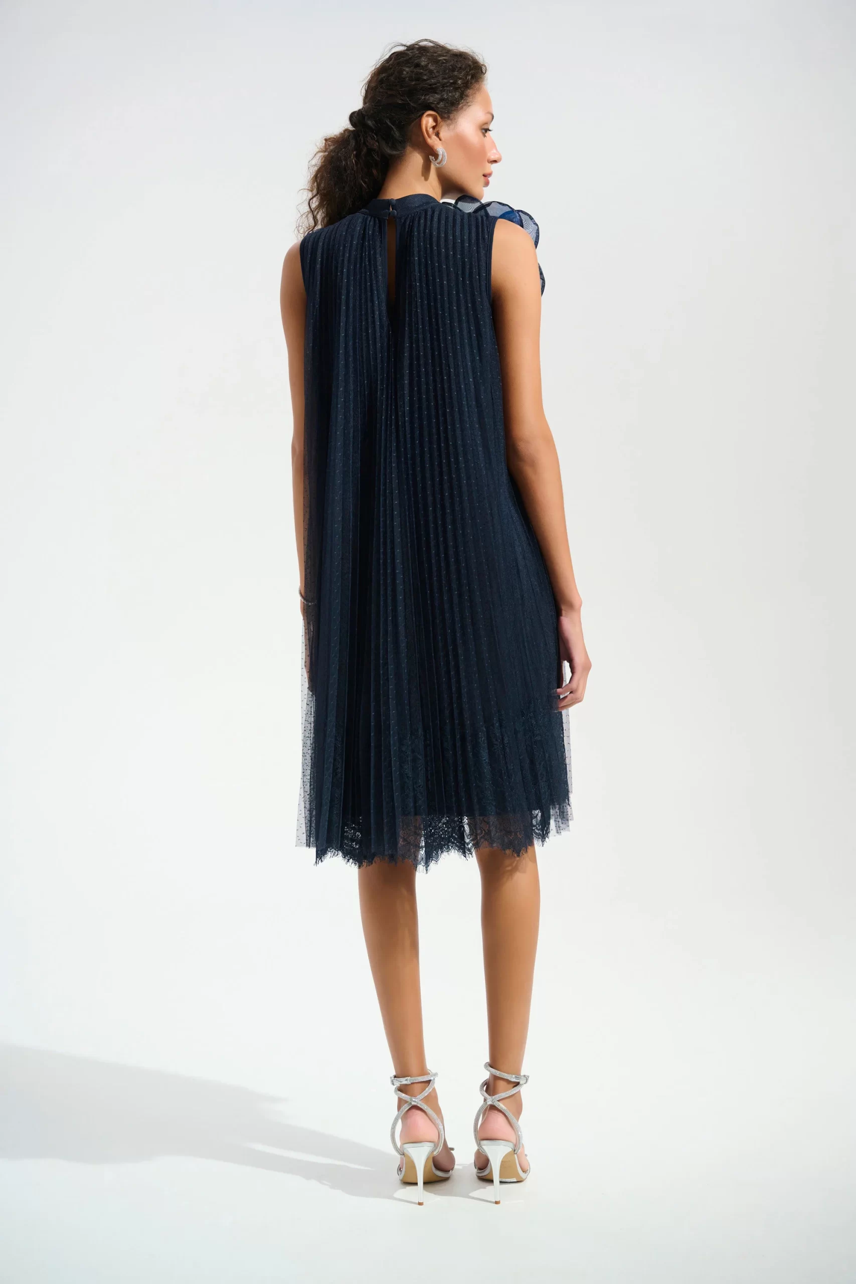 A soft mock neckline topped with an organza flower sets a refined tone for this layered A-line dress. Sheer dot mesh and a lace-trimmed hem bring delicate movement to the knee-length silhouette. Part of the Signature collection.