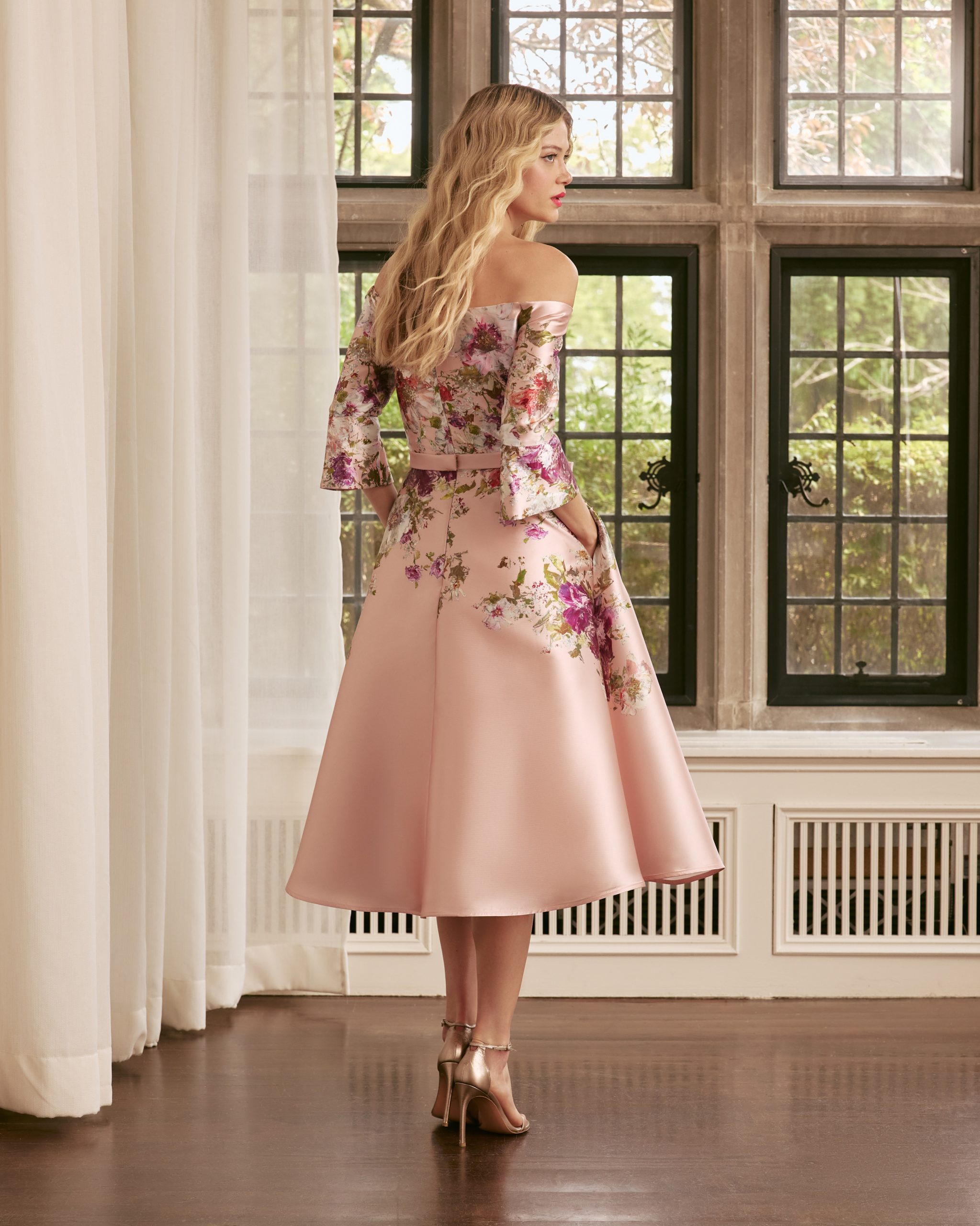 Off the shoulder dress Bodice with 3/4 bell sleeves and bow belt Aline skirt silhouette Hidden back zipper Satin lined