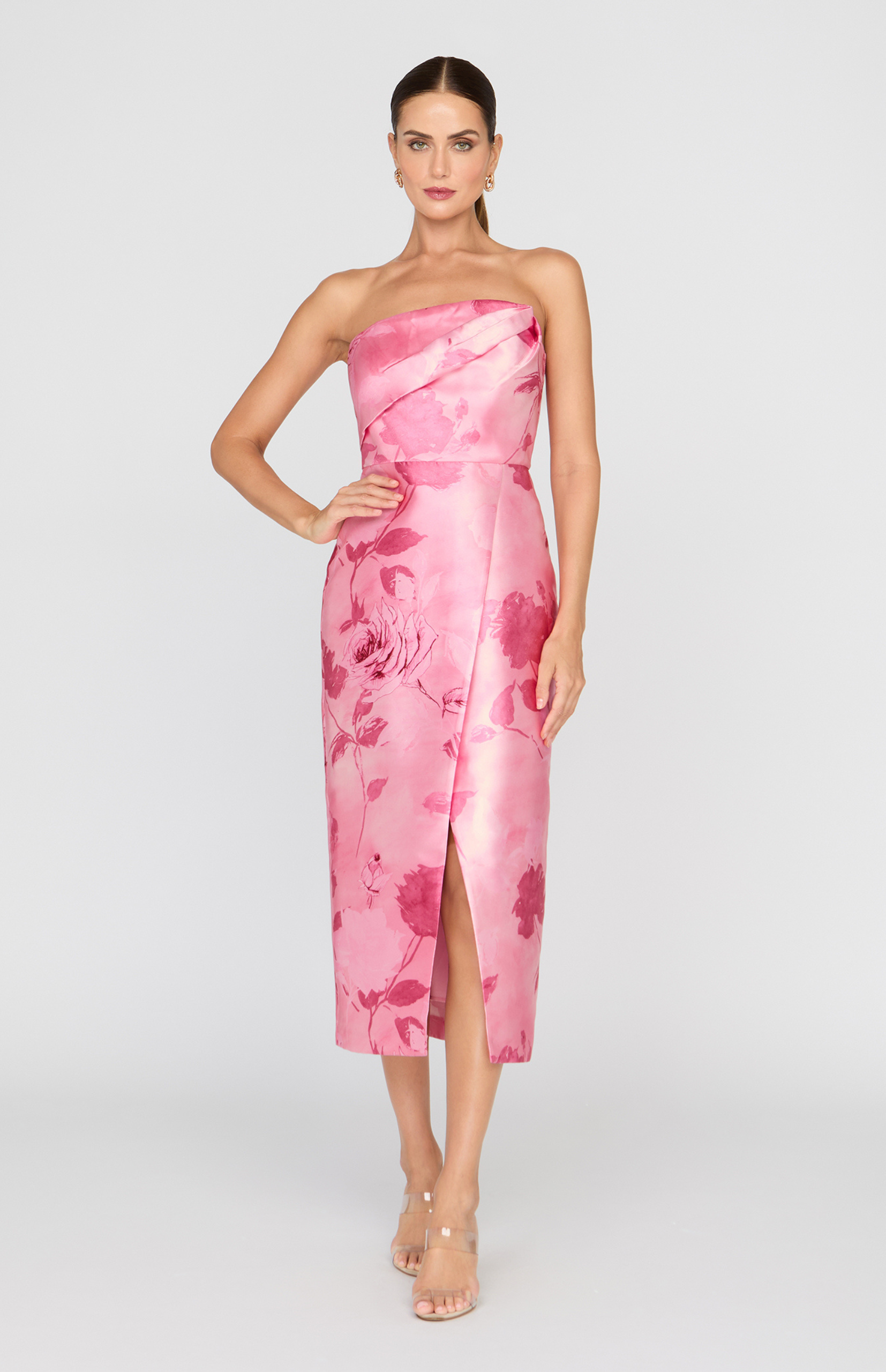 Signature mikado silhouette refreshed in a new painterly floral print, blending soft blush tones with bold botanical strokes. The structured fabric holds its shape while the skirt reveals subtle movement through a front slit. A striking choice for rehearsal dinners, wedding guest moments, cocktail parties, and Derby days.