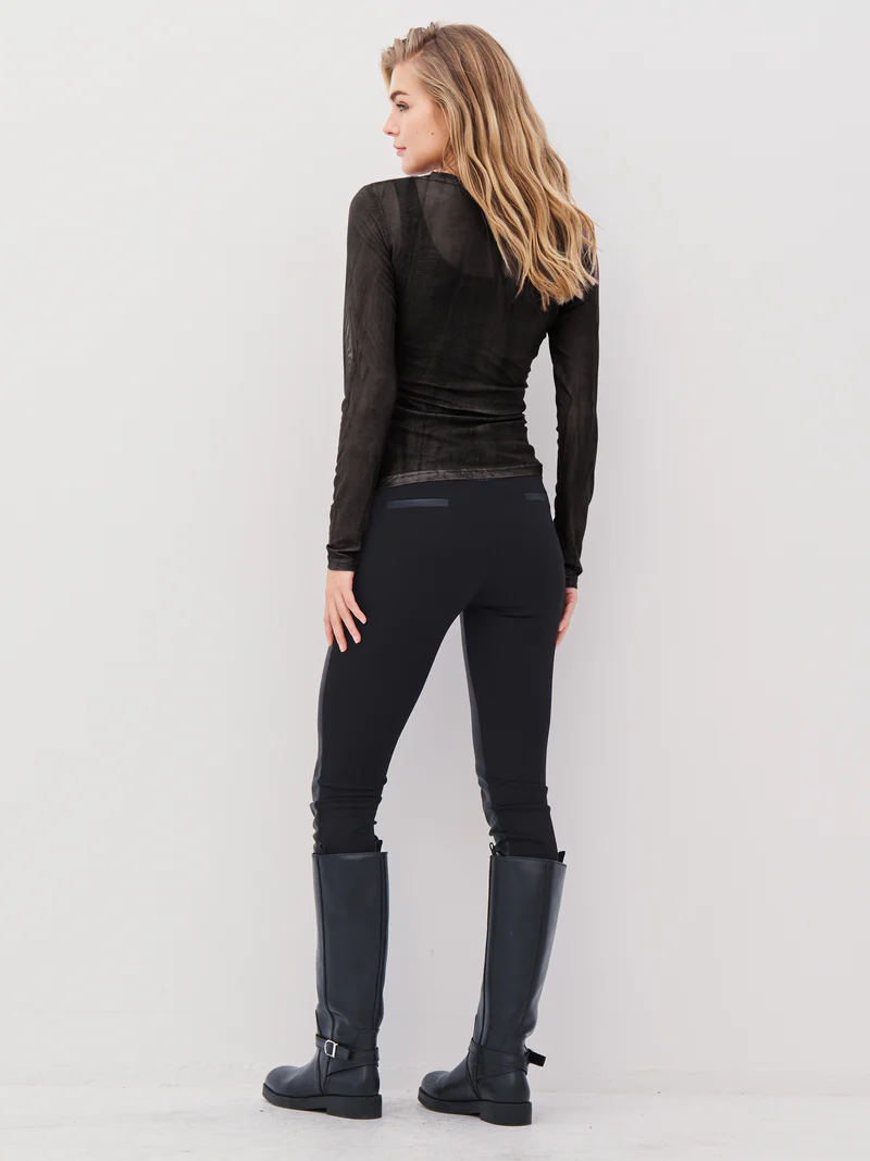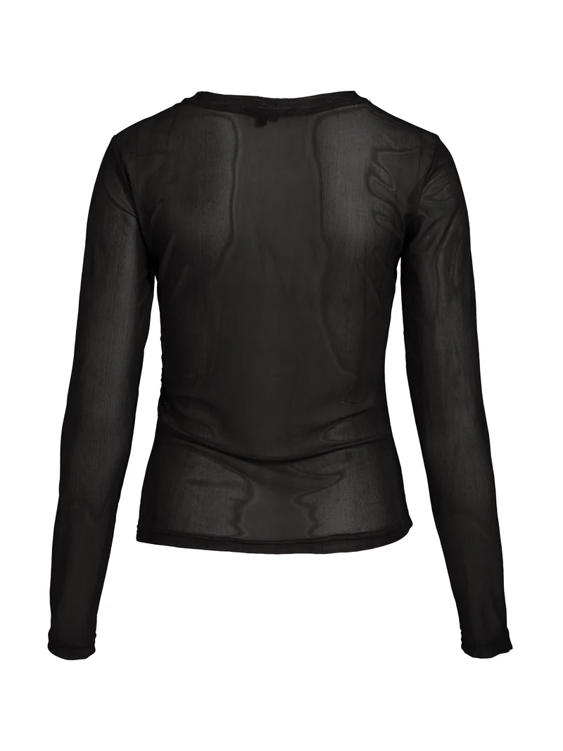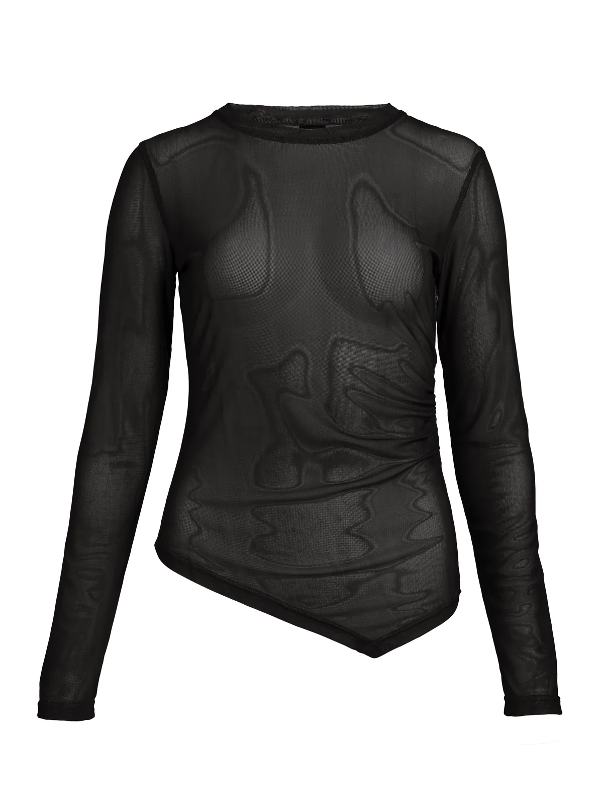 This mesh blouse has a slightly transparent expression and an asymmetric finish at the bottom, creating an exciting and modern silhouette. The material drapes lightly around the body, while the long sleeves and round neckline provide a simple and elegant look. The discreet seam details emphasize the blouse’s shape and make it suitable for layering or as a statement piece on its own.