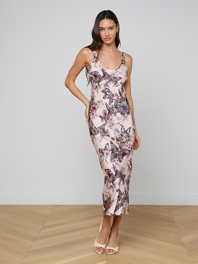 Minimal, elegant, and flattering, the Akiya dress is an evening essential. Lustrous, bias-cut satin drapes beautifully over the figure. Now back in light pink with a butterfly jungle print.