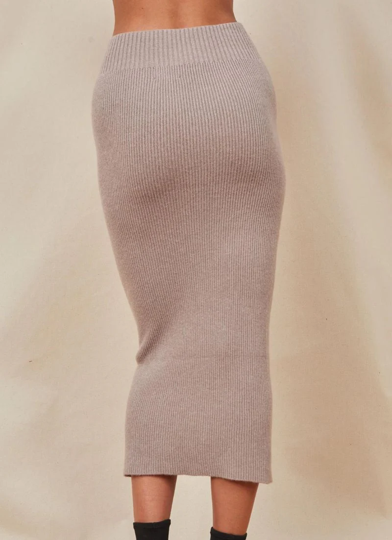 Stretch ribbed Viscose Knit midi skirt with amazing comfort and softness. Easy to team with your favourite flats or boots. Endless versatility and looks perfect with matching Alma Sweater