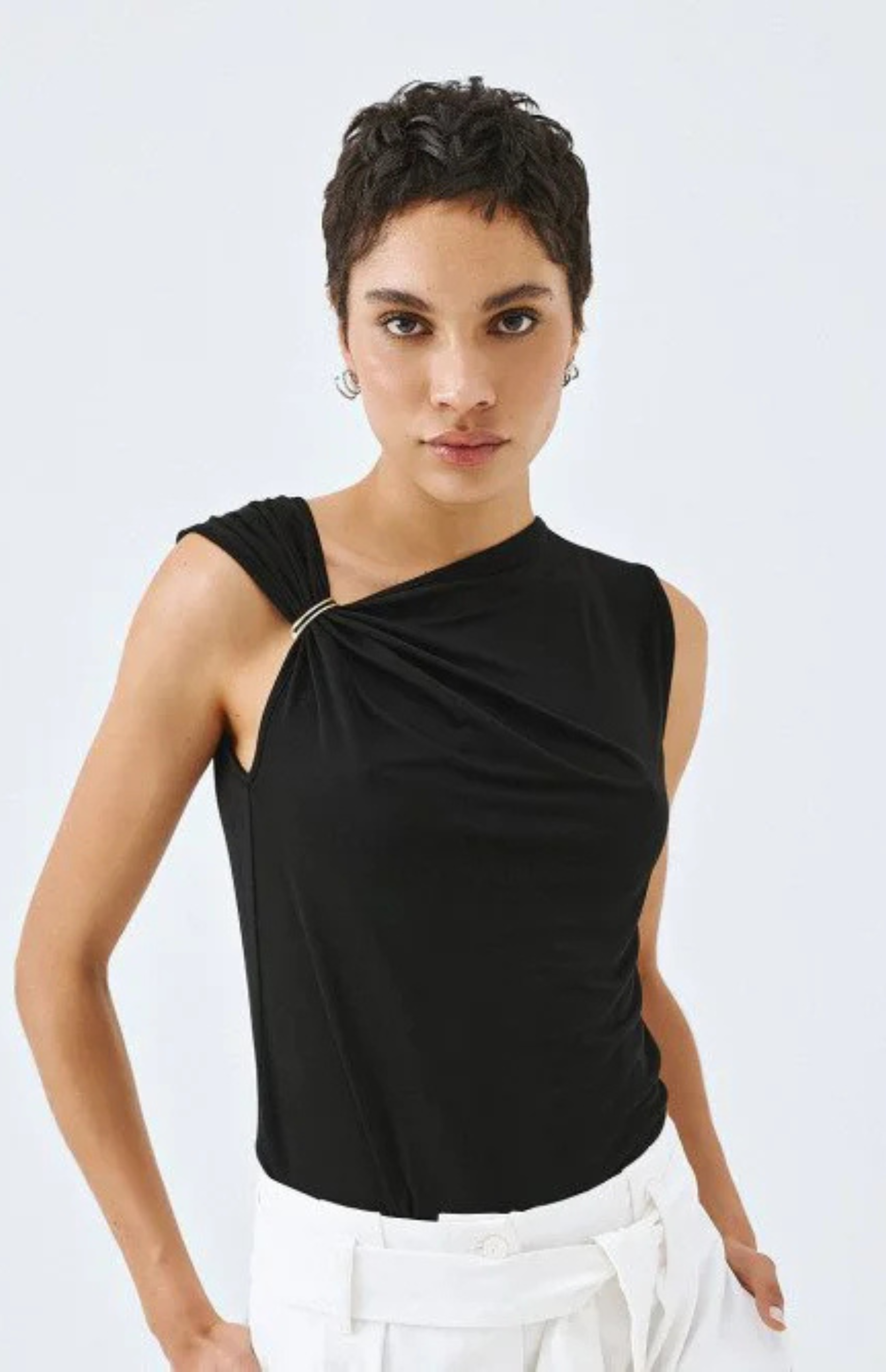 Sleeveless top with an asymmetric neckline and a metallic detail at the shoulder.