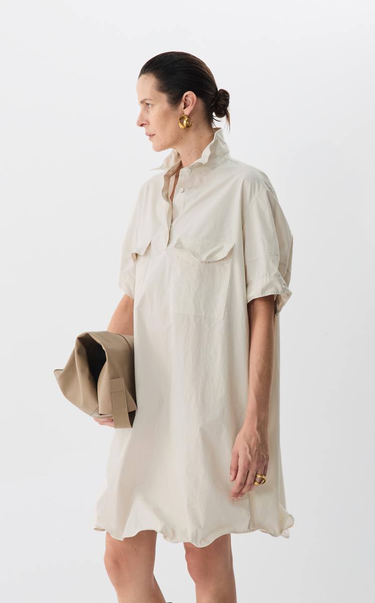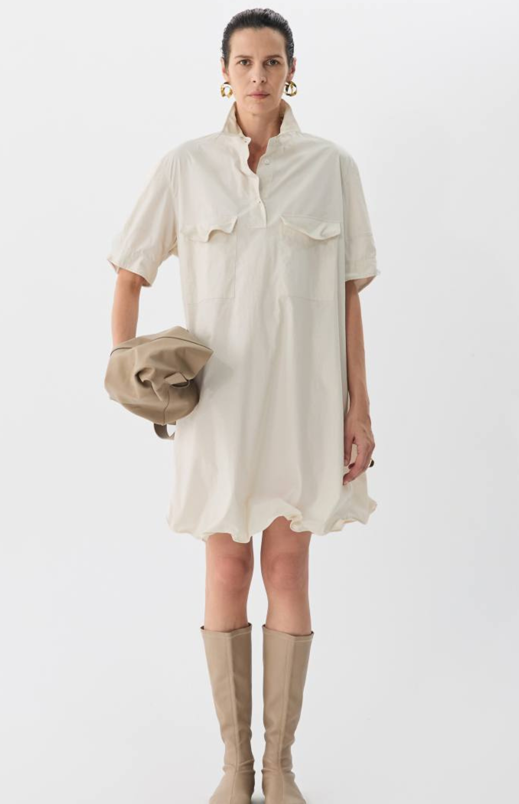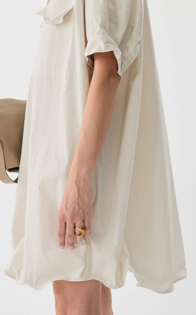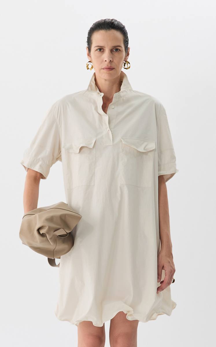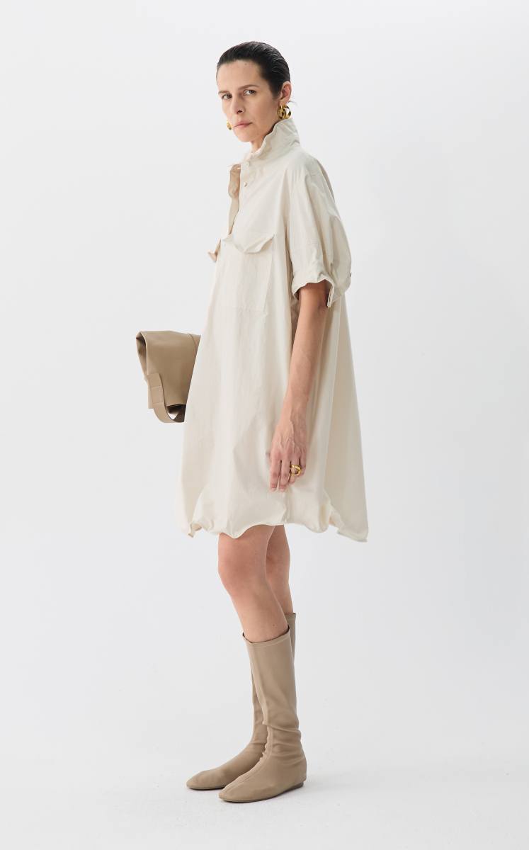 This stylish model offers the ability to be customized thanks to built-in wire elements. The collar, cuffs, hem, placket, and pocket flaps are equipped with flexible inserts, allowing you to customize the shape and silhouette. The dense fabric holds its shape perfectly, highlighting the architectural cut. The dress easily adapts to any style—from understated casual to more creative pieces.