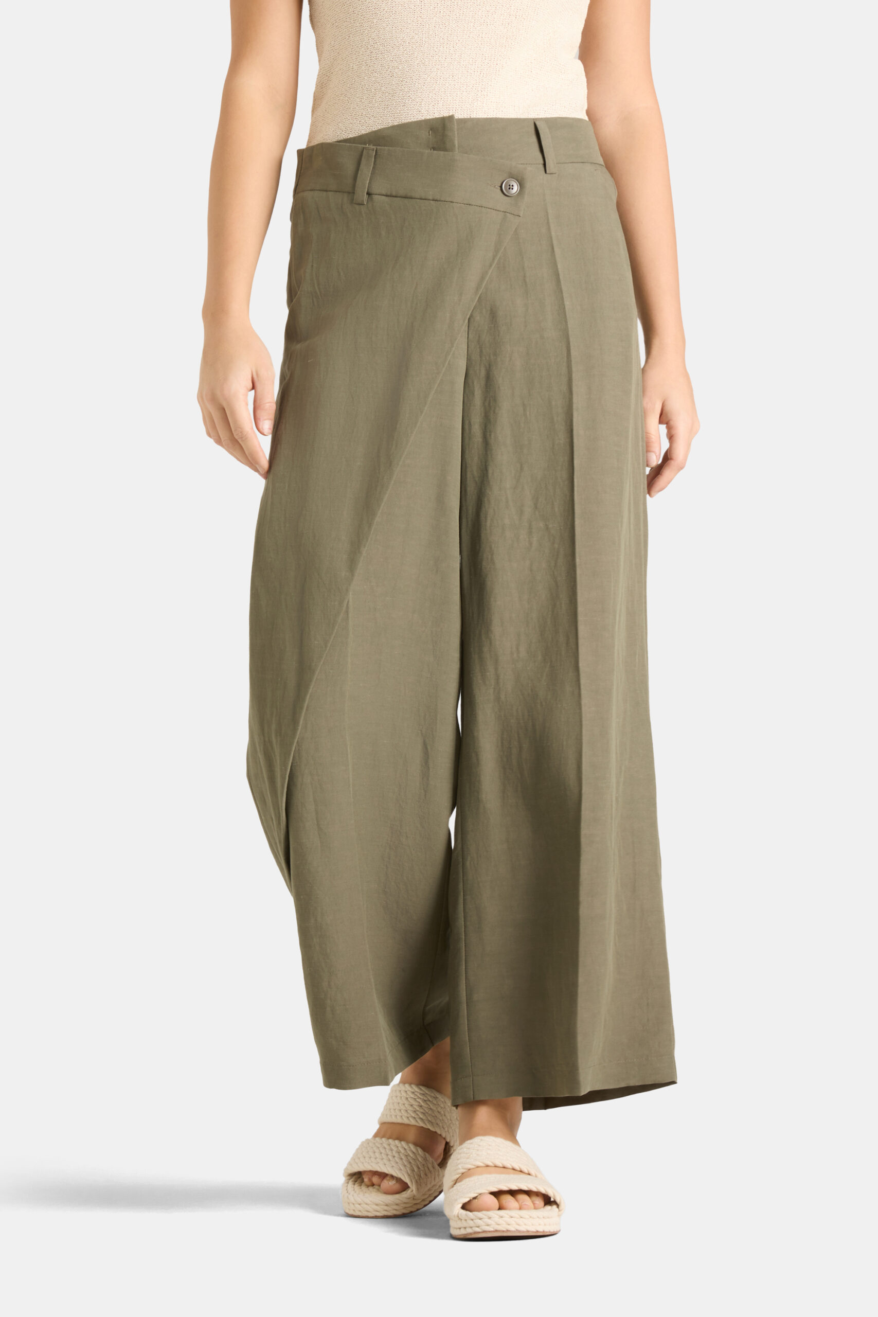 These trousers have a slanted button closure.