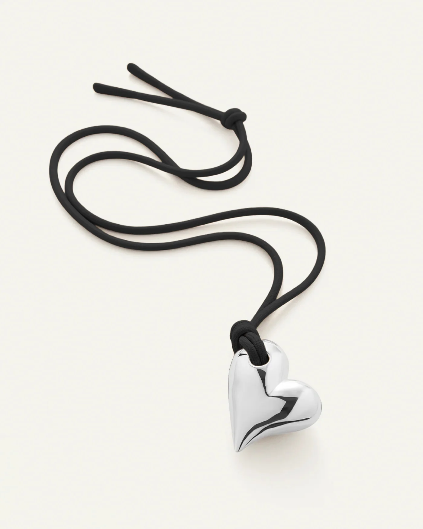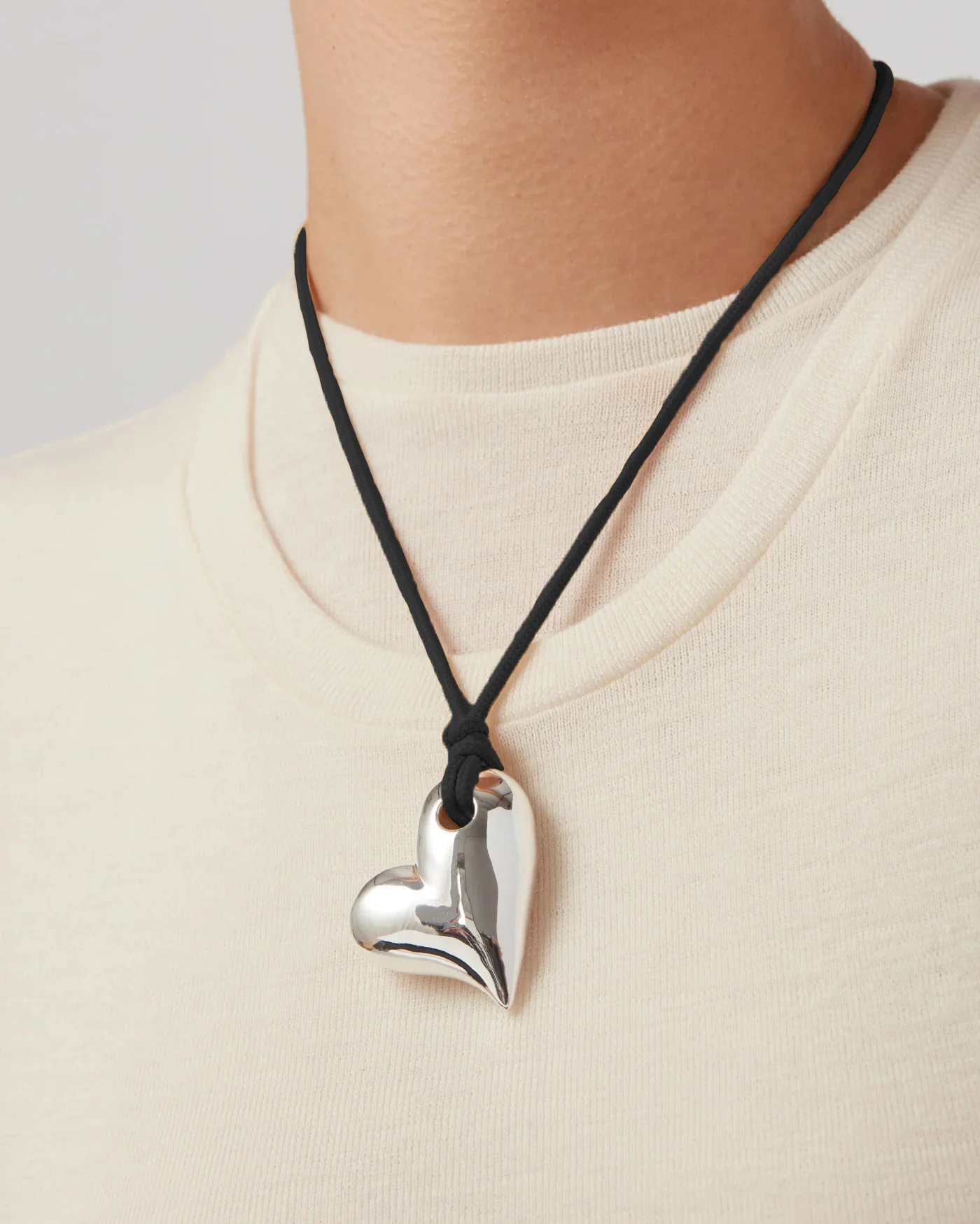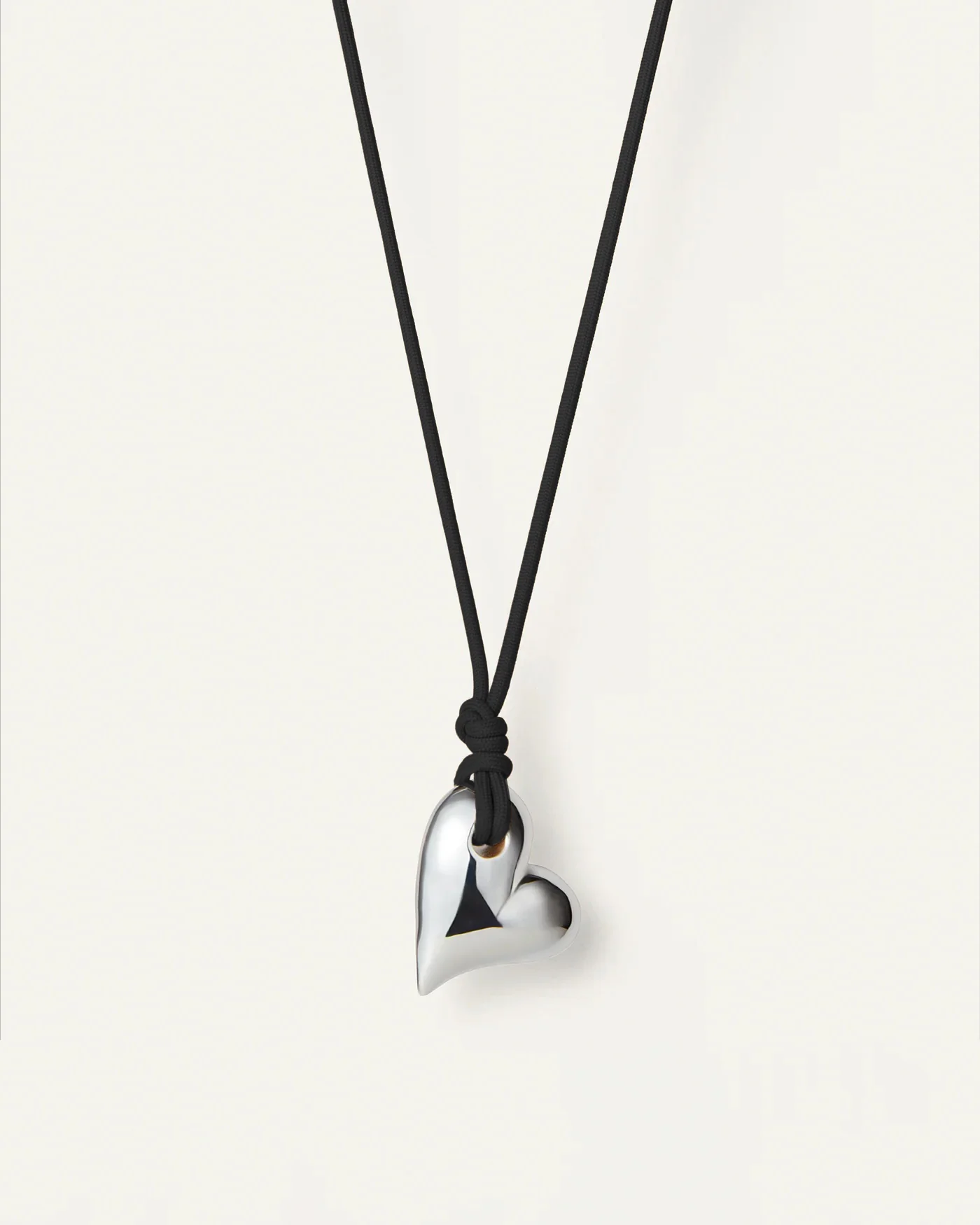 From Jenny Bird, this voluminous silver heart pendant hangs from an adjustable black cord made of recycled polyester. Finished in high-polish silver.
