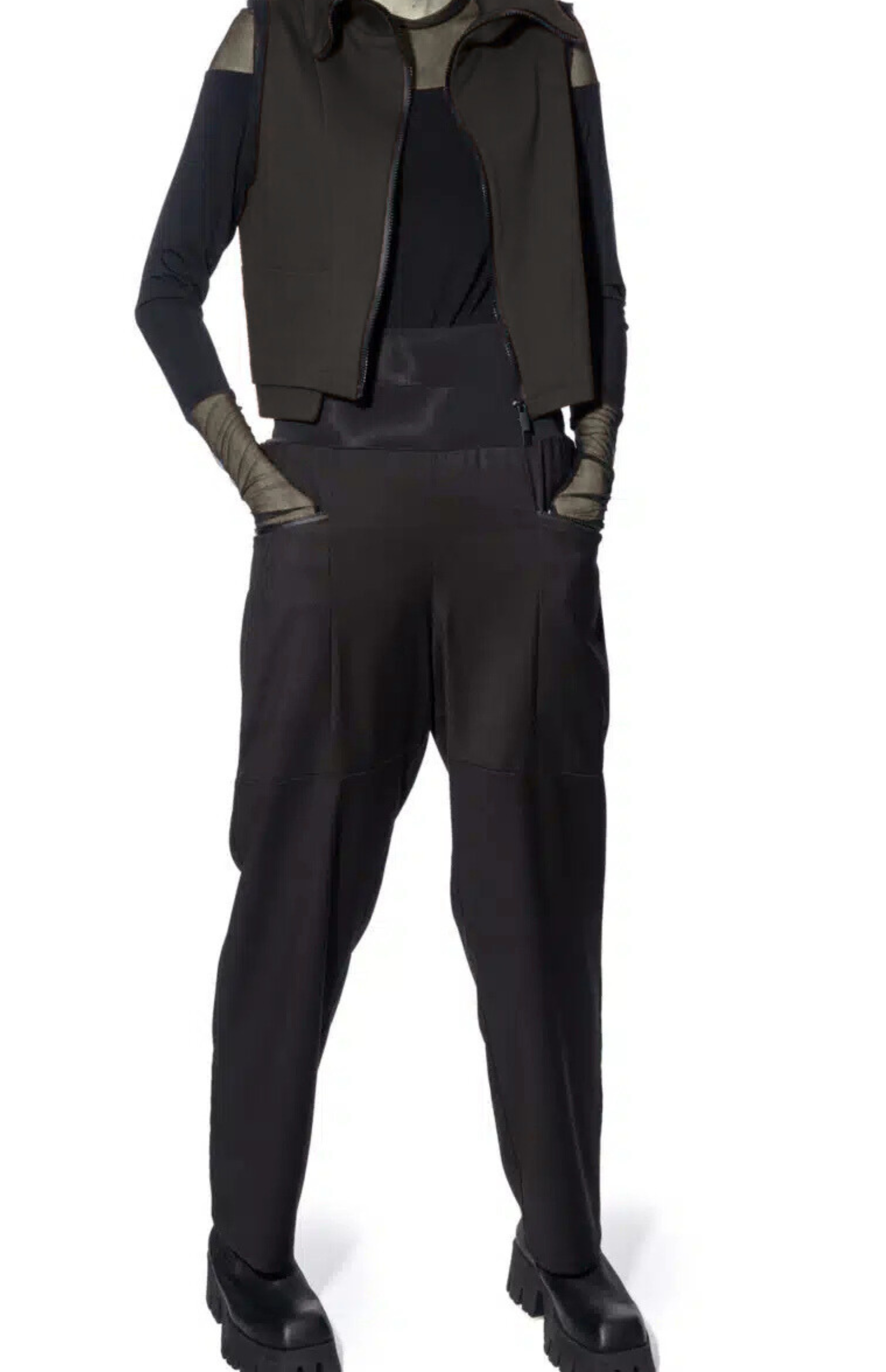 A contemporary utility style vest with strict turtleneck and pocket for smartphone. Always equipped with a practical garment that allows you to leave the handbag at home.