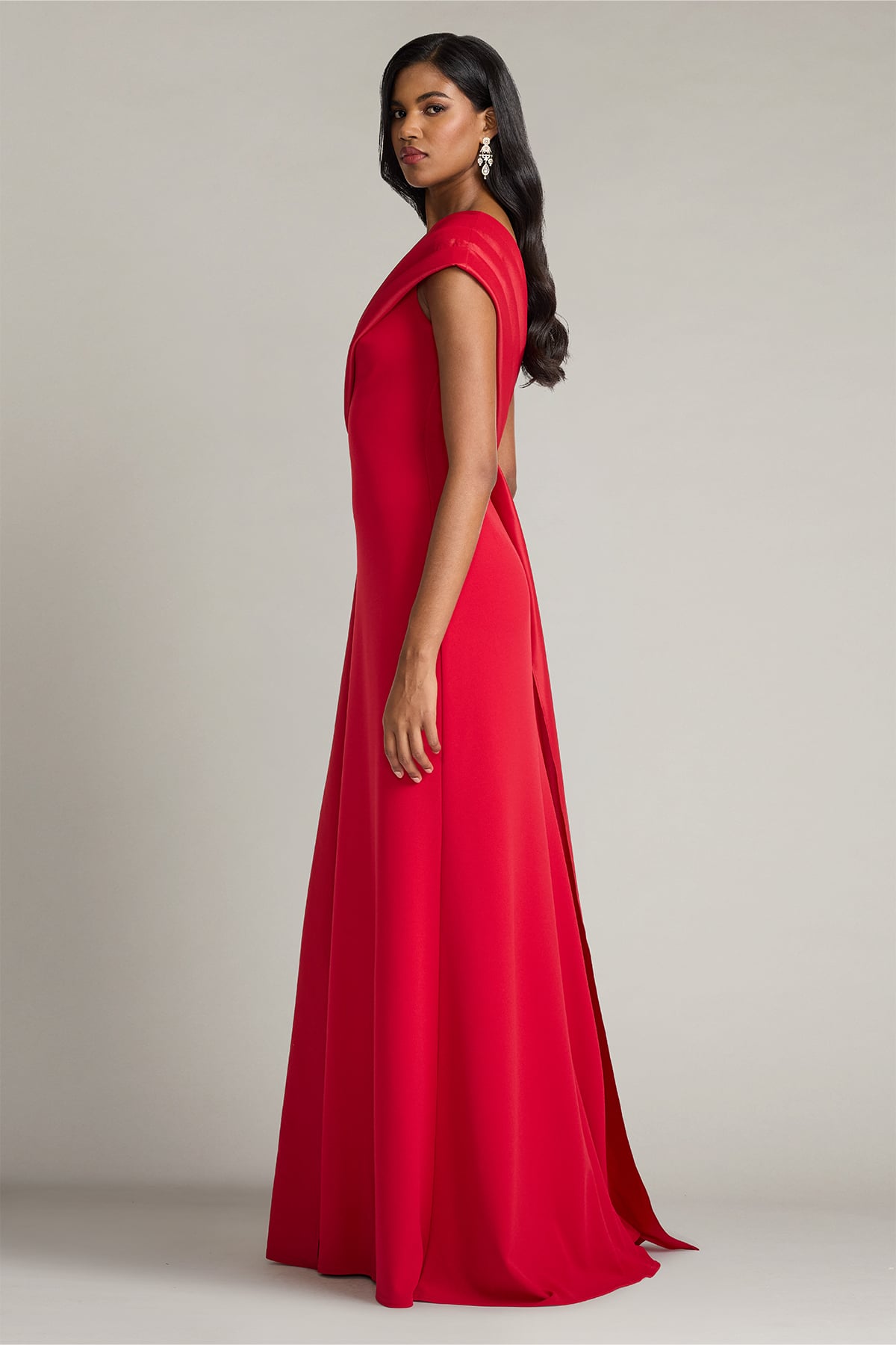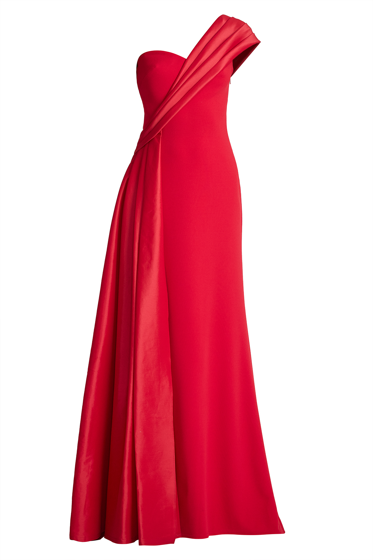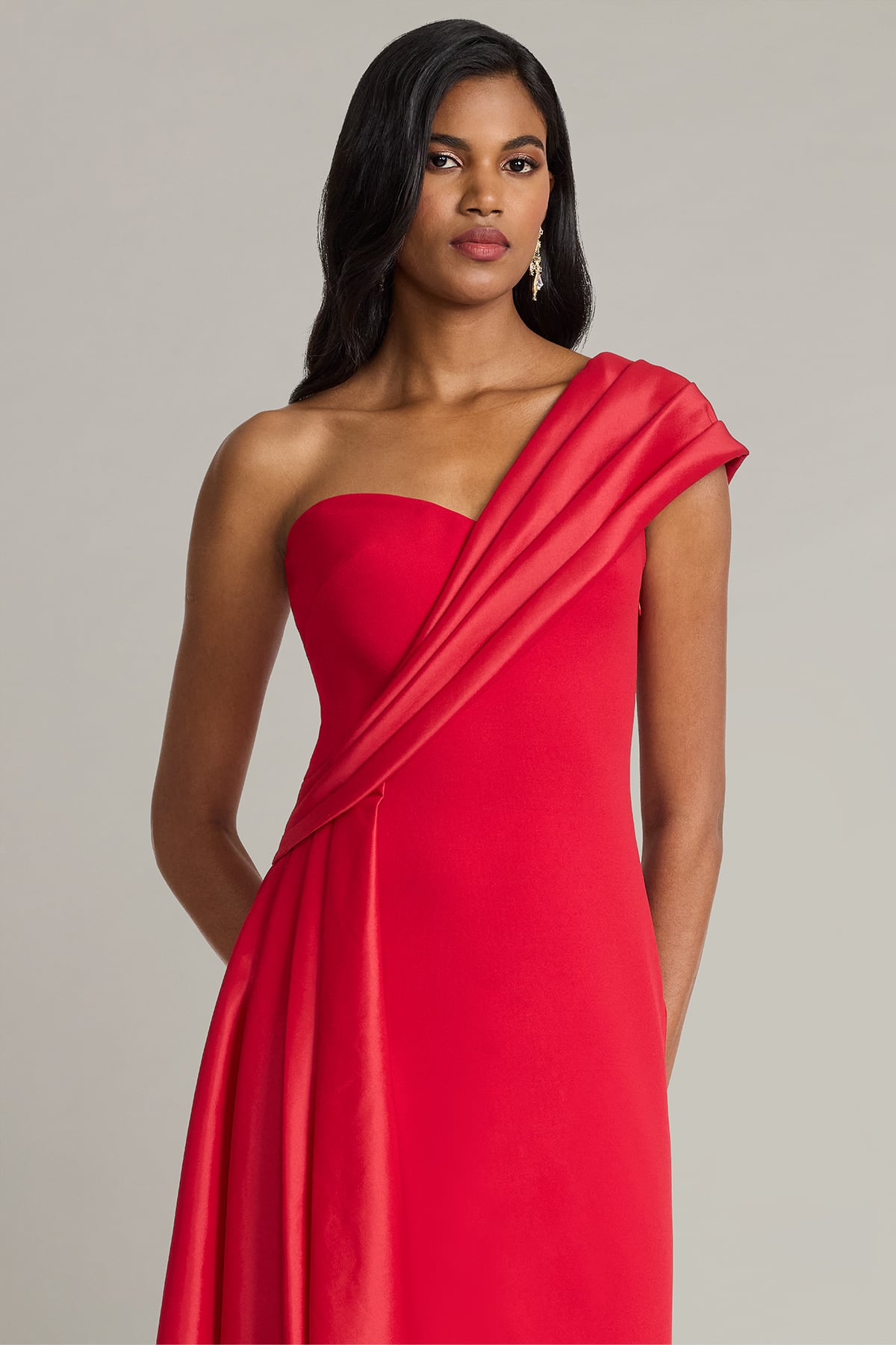 This textured crepe gown features a striking one-shoulder neckline with sculptural taffeta draping that cascades elegantly across the bodice. A softly structured silhouette elongates the figure, while the fluid skirt creates graceful movement with every step. Concealed side zip.