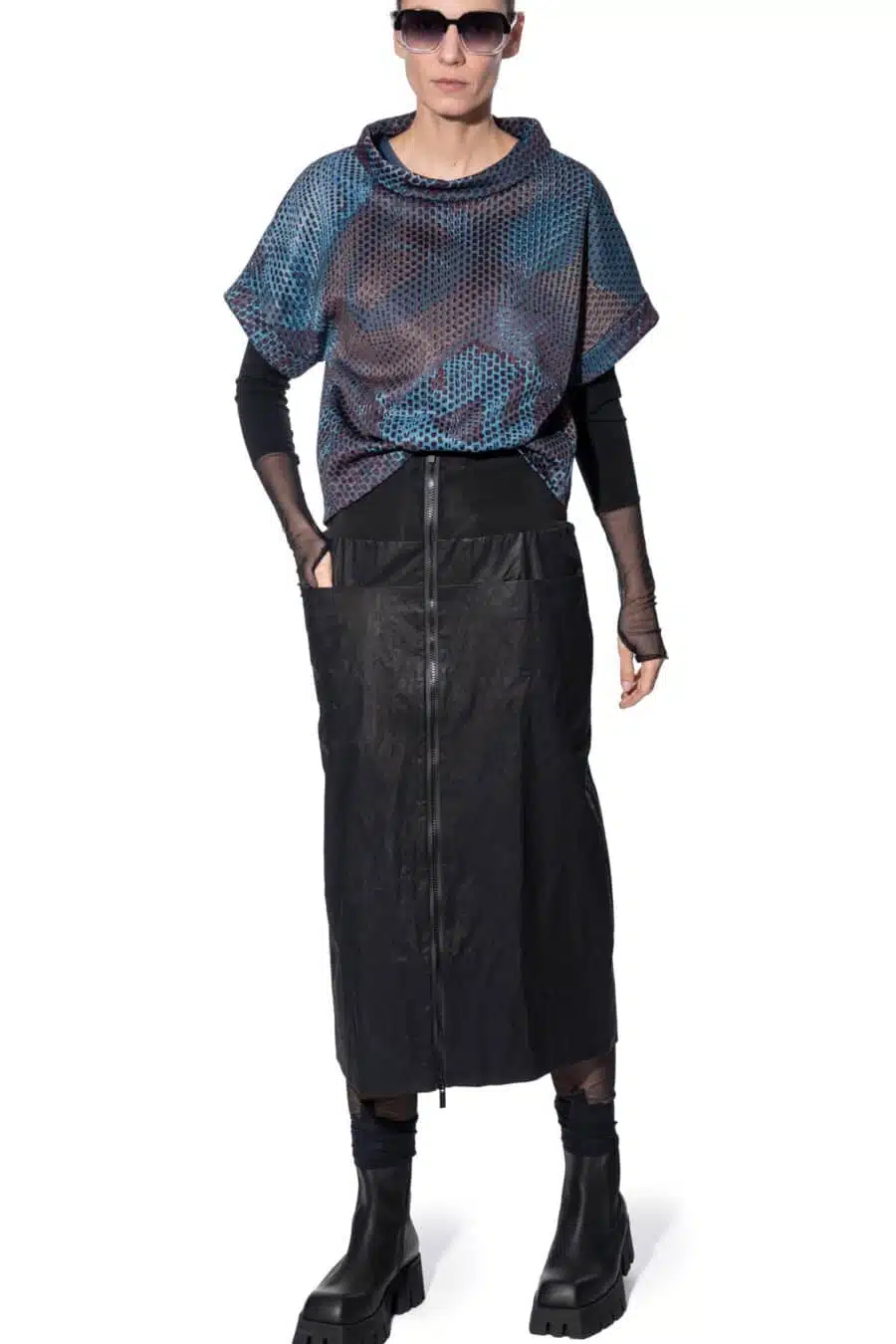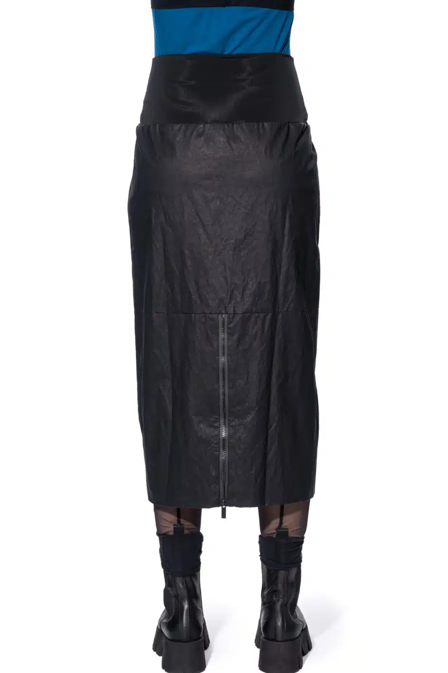 This straight-cut midi skirt blends modern elegance with functionality. Horizontal seam pockets offer practical storage, while the front zipper adds a stylish touch. The elastic jersey waistband ensures comfort and the back zipper slit enhances ease of movement. A versatile skirt perfect for chic pairings.