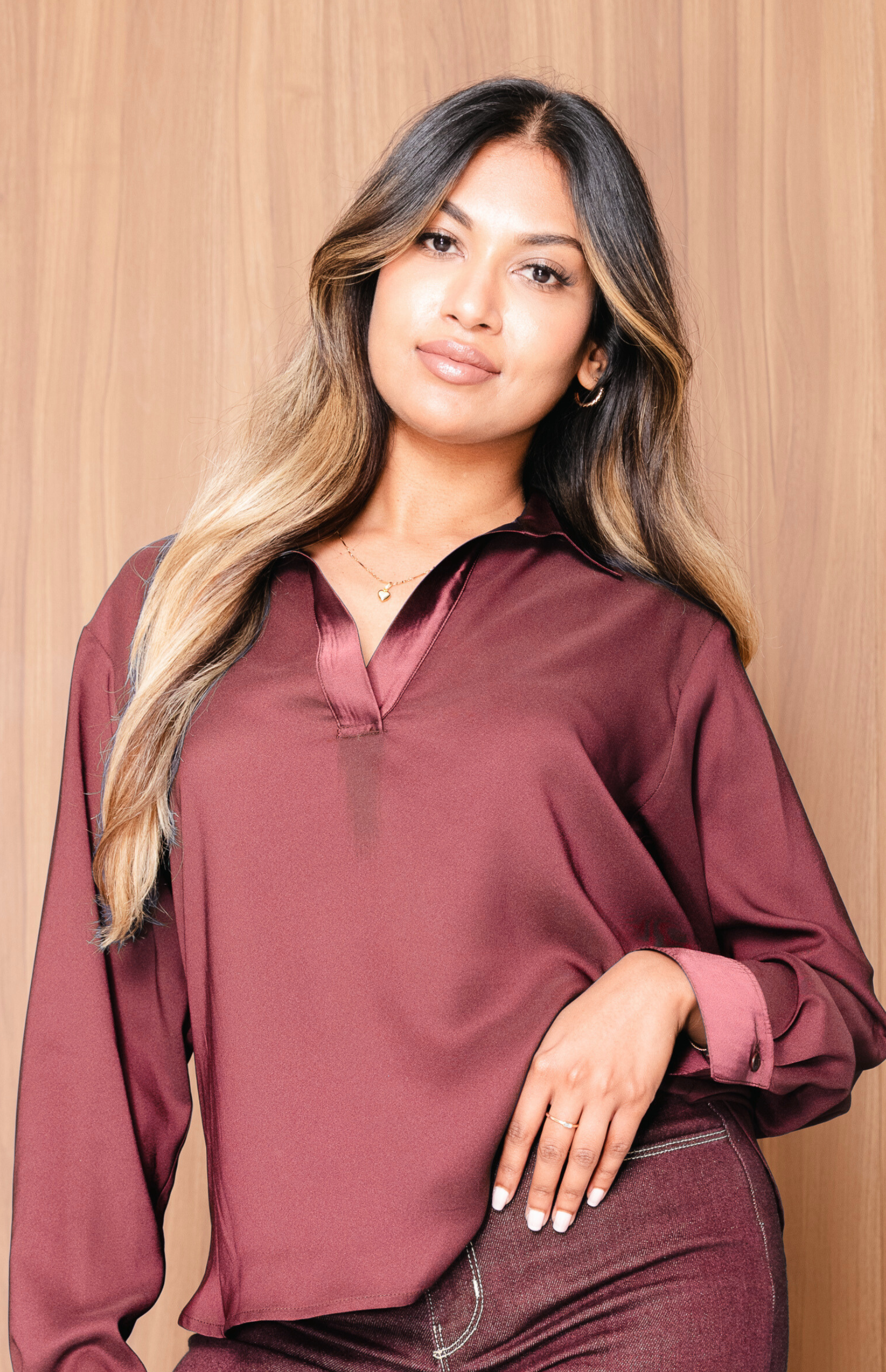 Featuring a modern V-neckline with a soft collar, the Penelope adds a touch of polish to any outfit—perfect for the office, evenings out, or casual chic days. The long sleeves with tailored cuffs create a refined silhouette, while the relaxed fit ensures all-day ease.