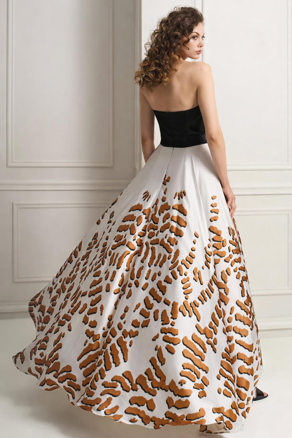 SWEET-NECK DRESS IN SOLID BLACK PLEATED FABRIC, ANIMAL PRINT LOWER PART, WHITE BASE AND ORANGE SPOTS