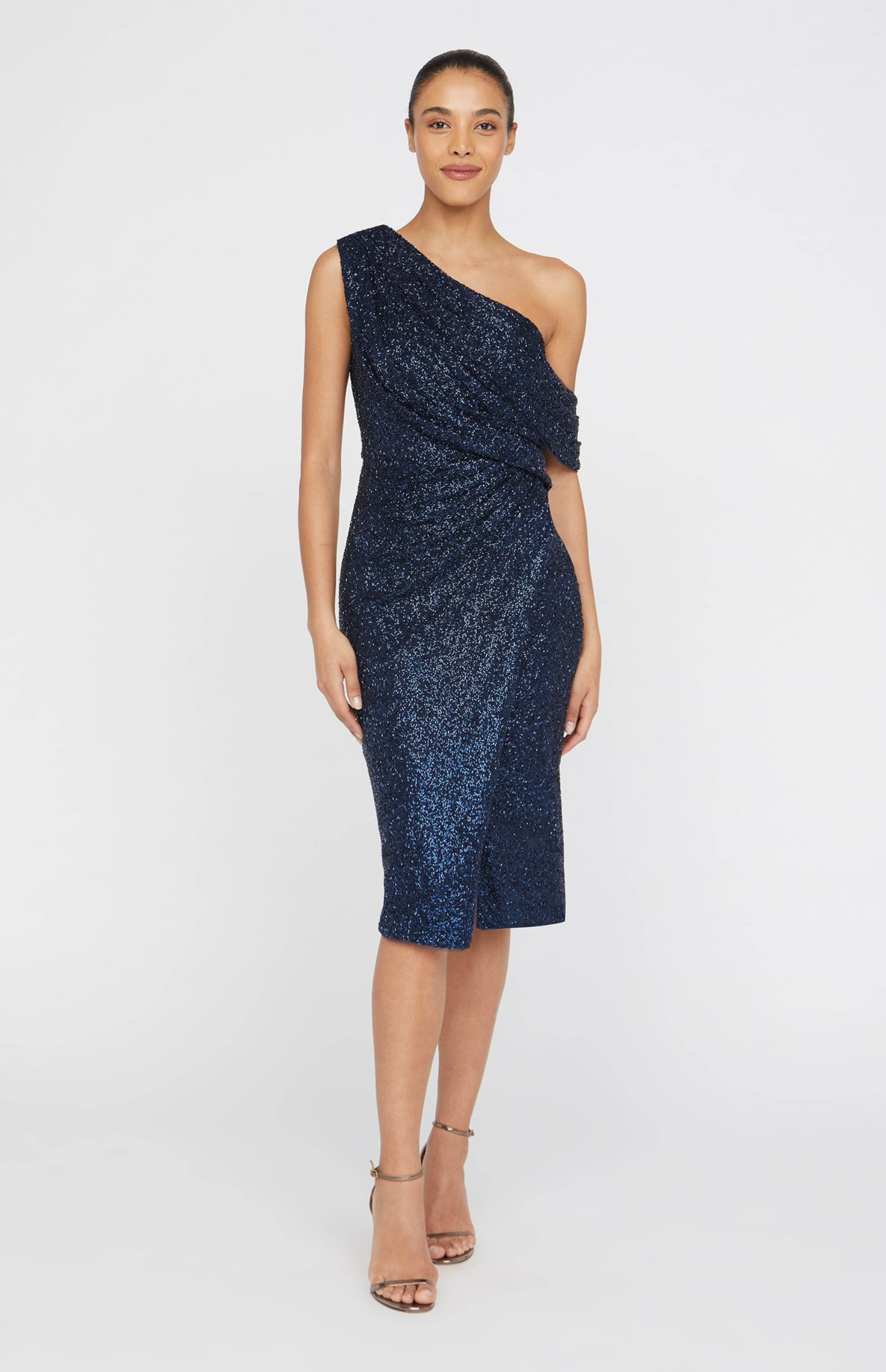Sequined one shoulder draped bodice with asymmetric midi wrap skirt.