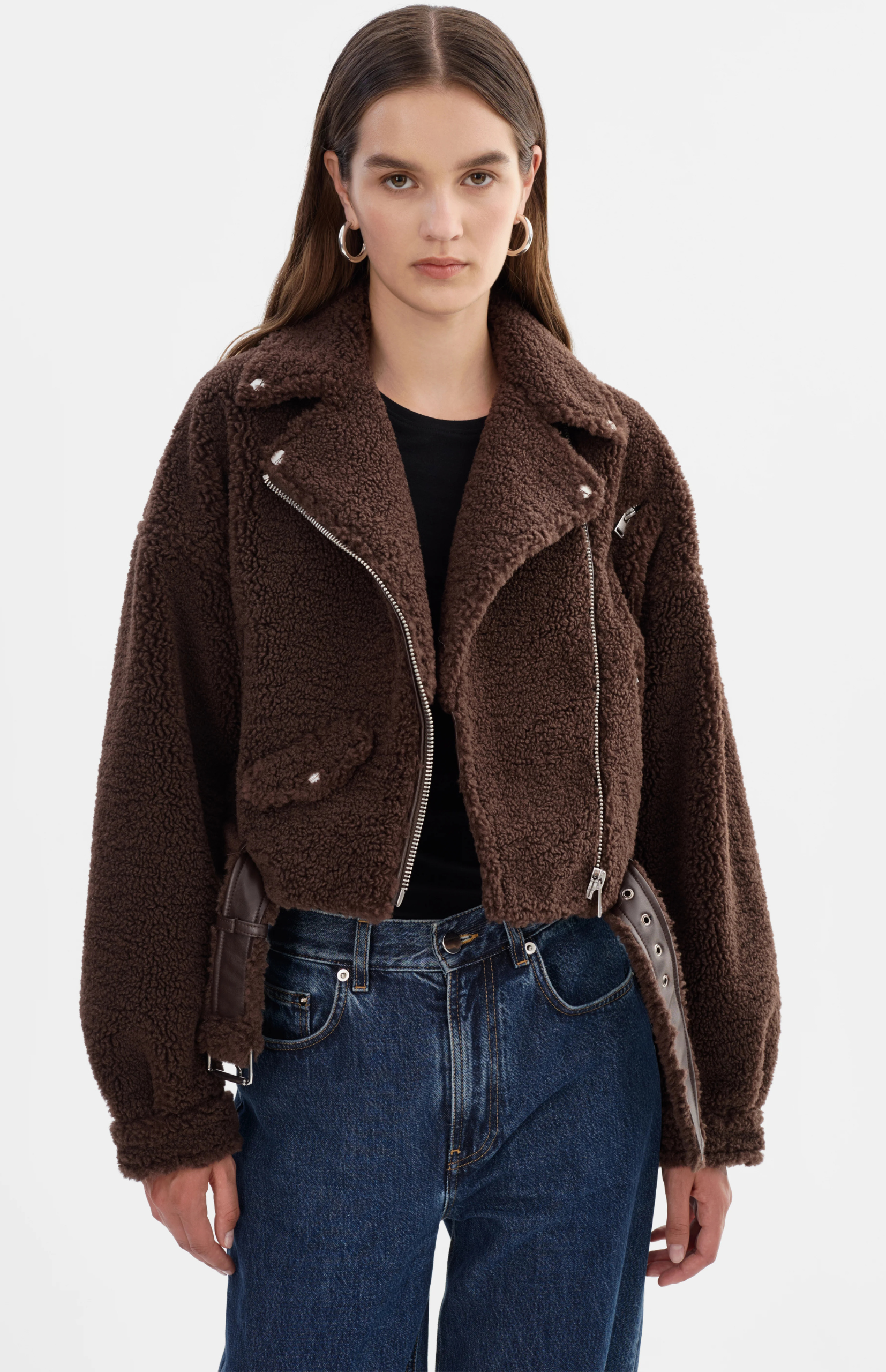 A classic shape with a cozy twist. The BRINA Sherpa Cropped Jacket reimagines the iconic moto silhouette in plush sherpa. With its asymmetrical zip closure, oversized lapels, and belted waist, it blends rugged edge with luxe texture, making it a standout layer you’ll reach for on repeat.