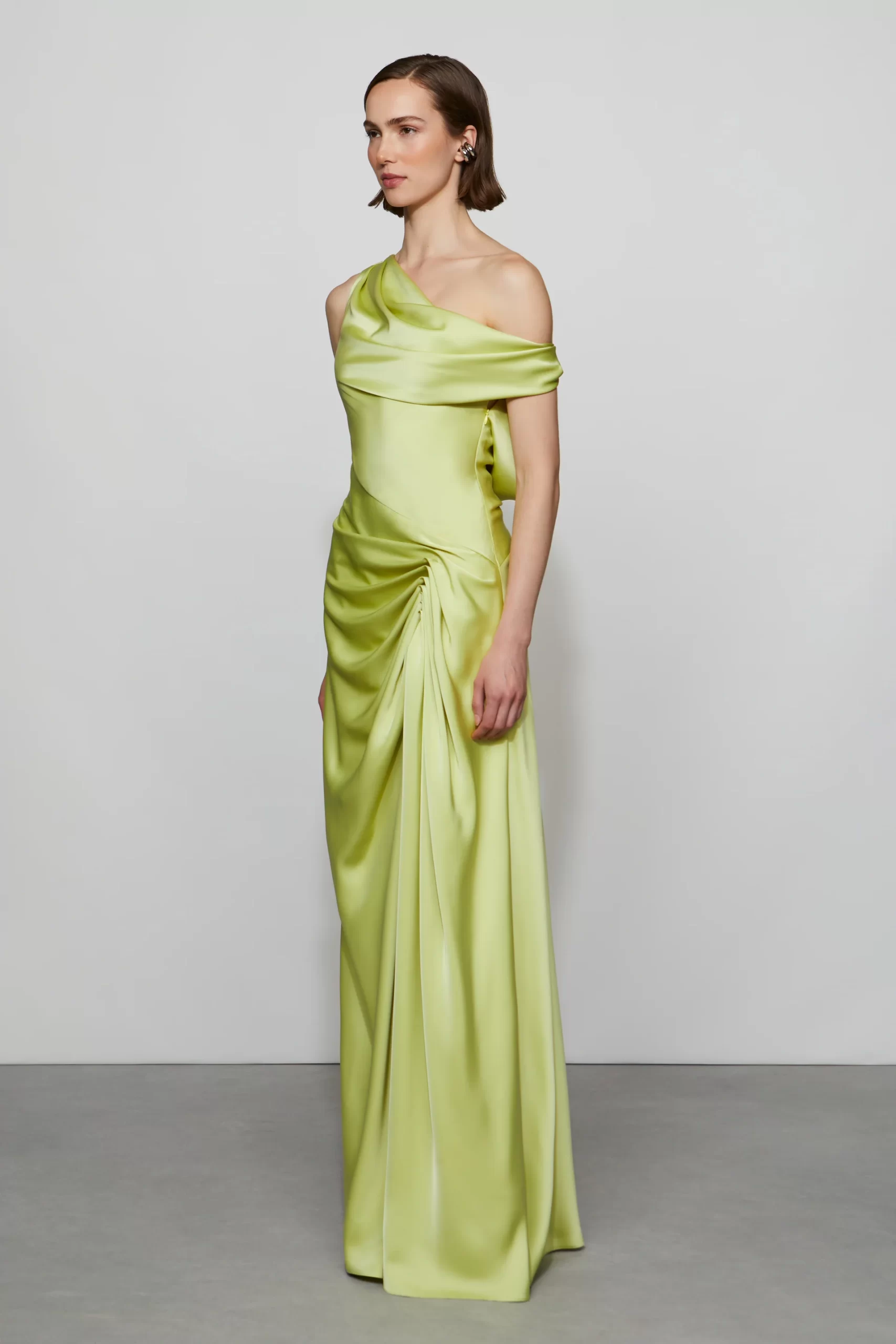 Celery-toned satin with a draped neckline, stacked folds at the slit, and an open back—ideal for destination nights, black-tie, and gala dressing.