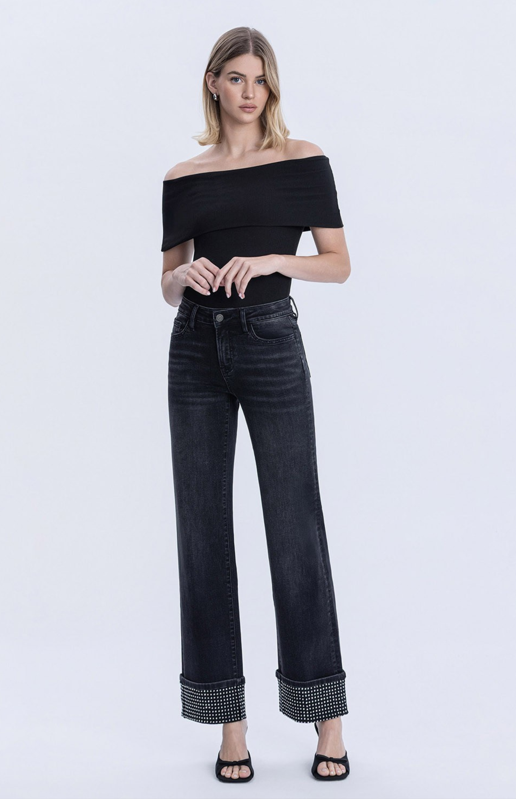 MID RISE RHINESTONE CUFFED BLACK SLIM WIDE JEANS