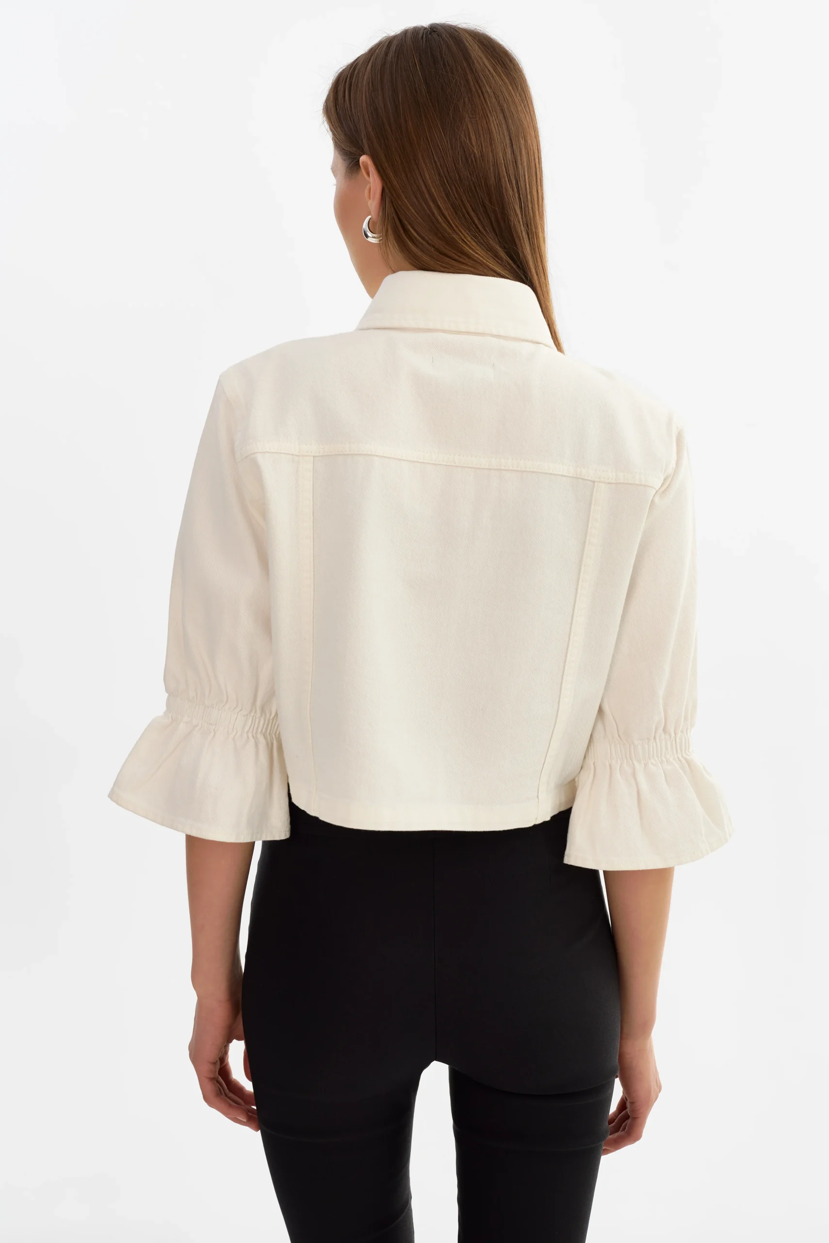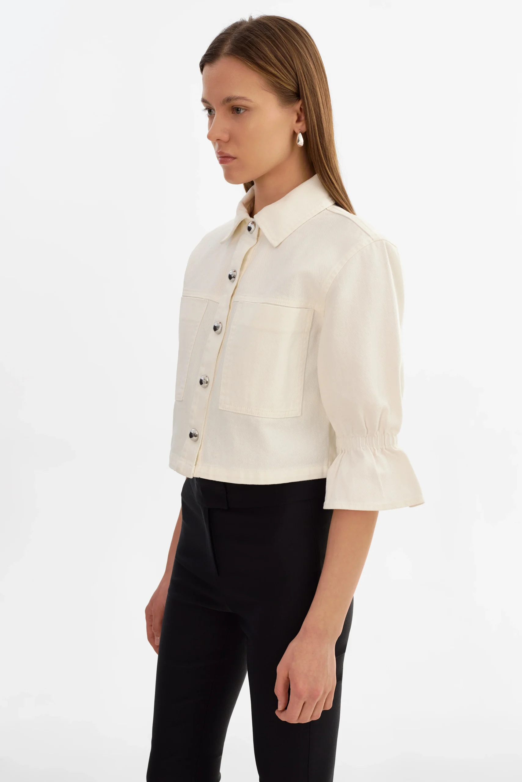 Designed with a relaxed fit, it features cropped ruffled sleeves, a snap-front closure, and oversized patch pockets for a modern utility feel.