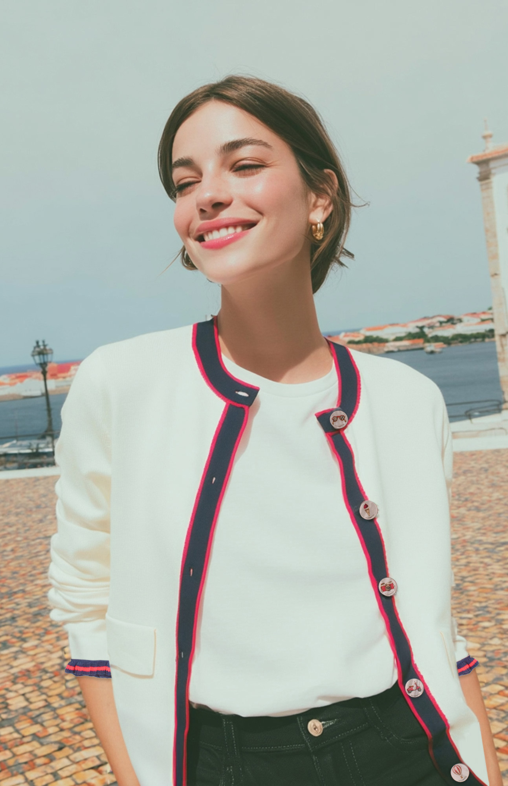 Off-white jacket with a round neck and front button closure with patterned buttons. Contrasting navy and red trim on the collar, placket, and hem. Includes two decorative front pockets. Cuffs finished with a two-tone ruffle.