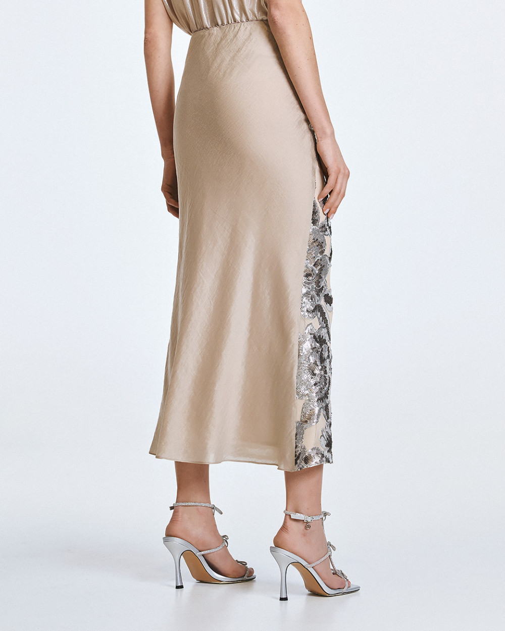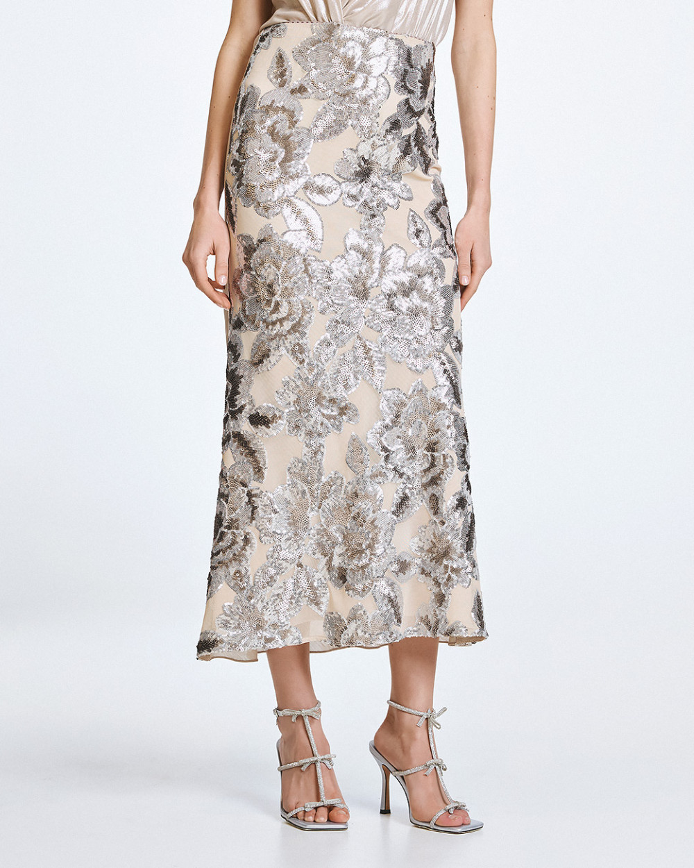 Midi skirt made from a combination of fabrics, featuring tulle with floral sequin embroidery at the front and a crinkled texture at the back. It features an elastic waist and an inner lining.