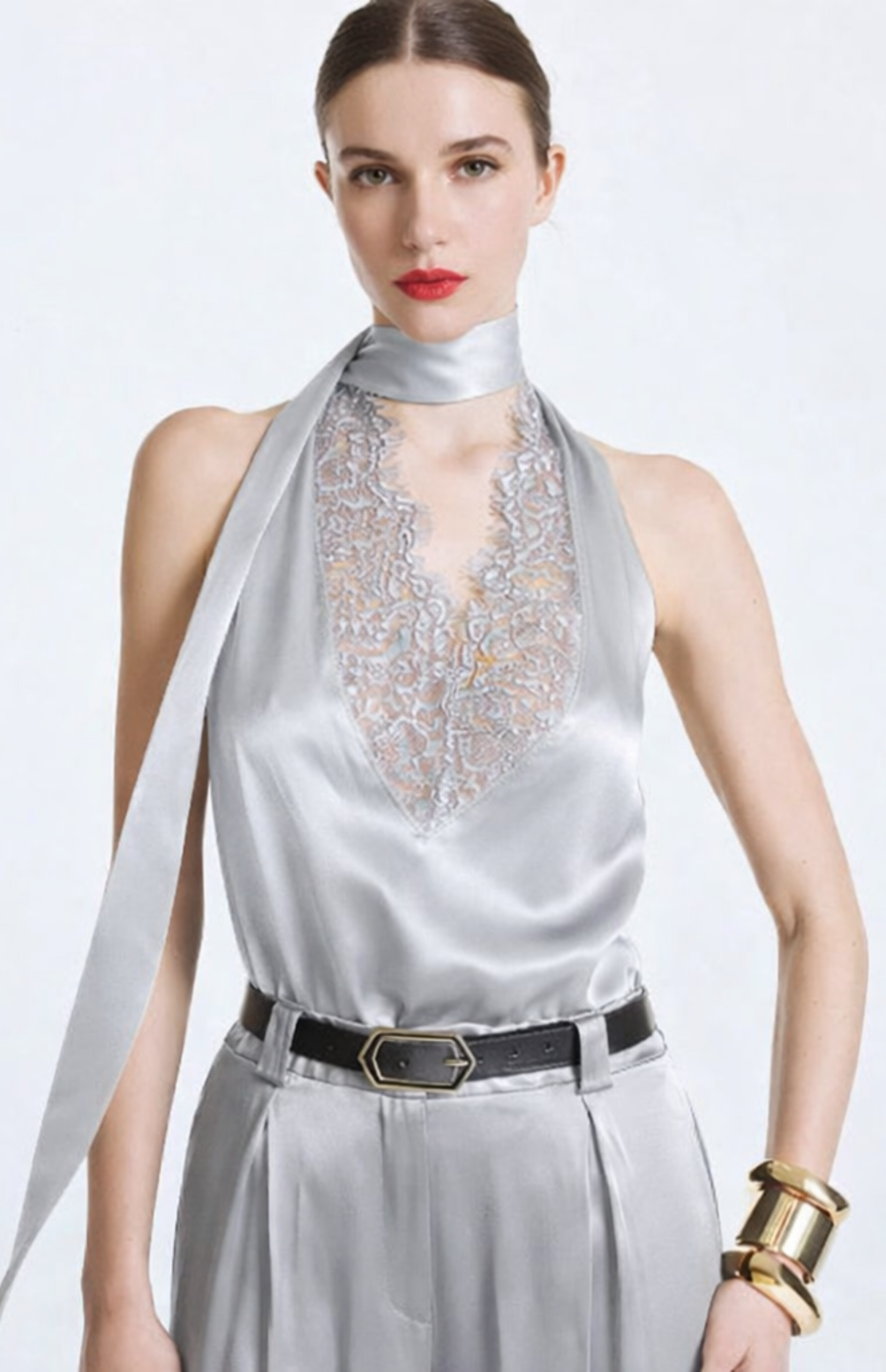 Halter top with lace detail at the neckline and a detachable scarf. Features an open back and an elastic band at the back for a comfortable fit.