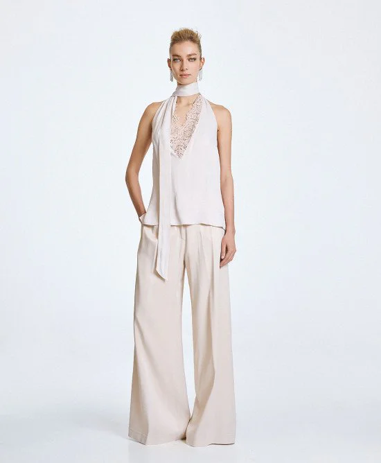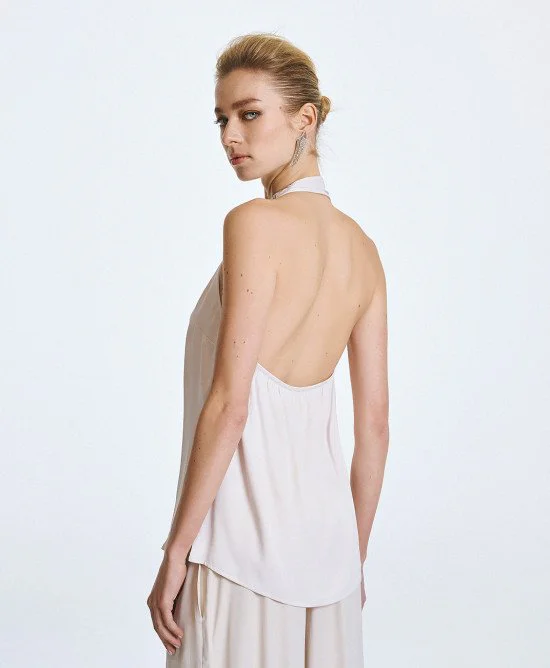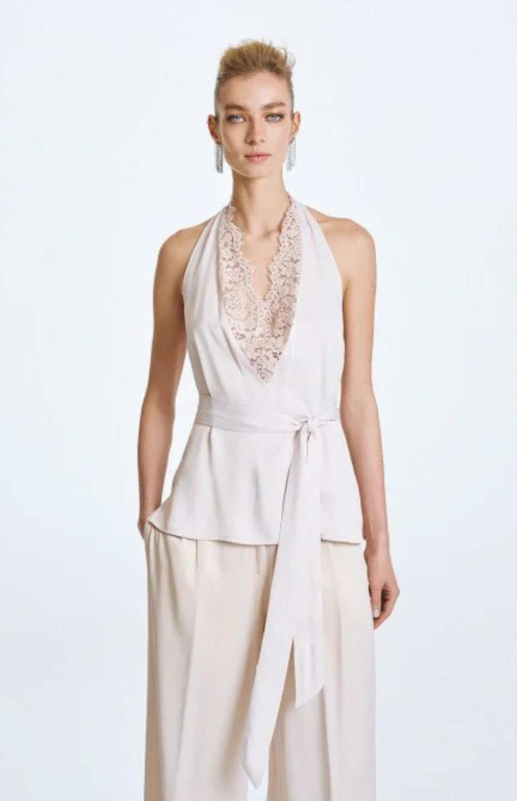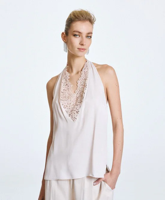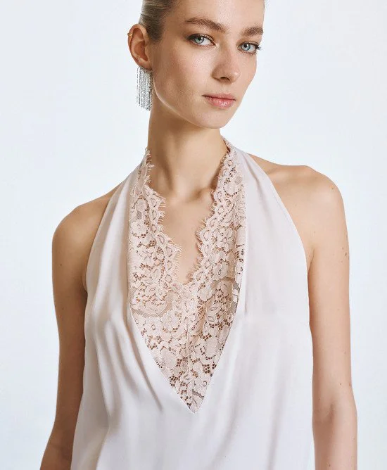 Halter top with lace detail at the neckline and a detachable scarf. Features an open back and an elastic band at the back for a comfortable fit.