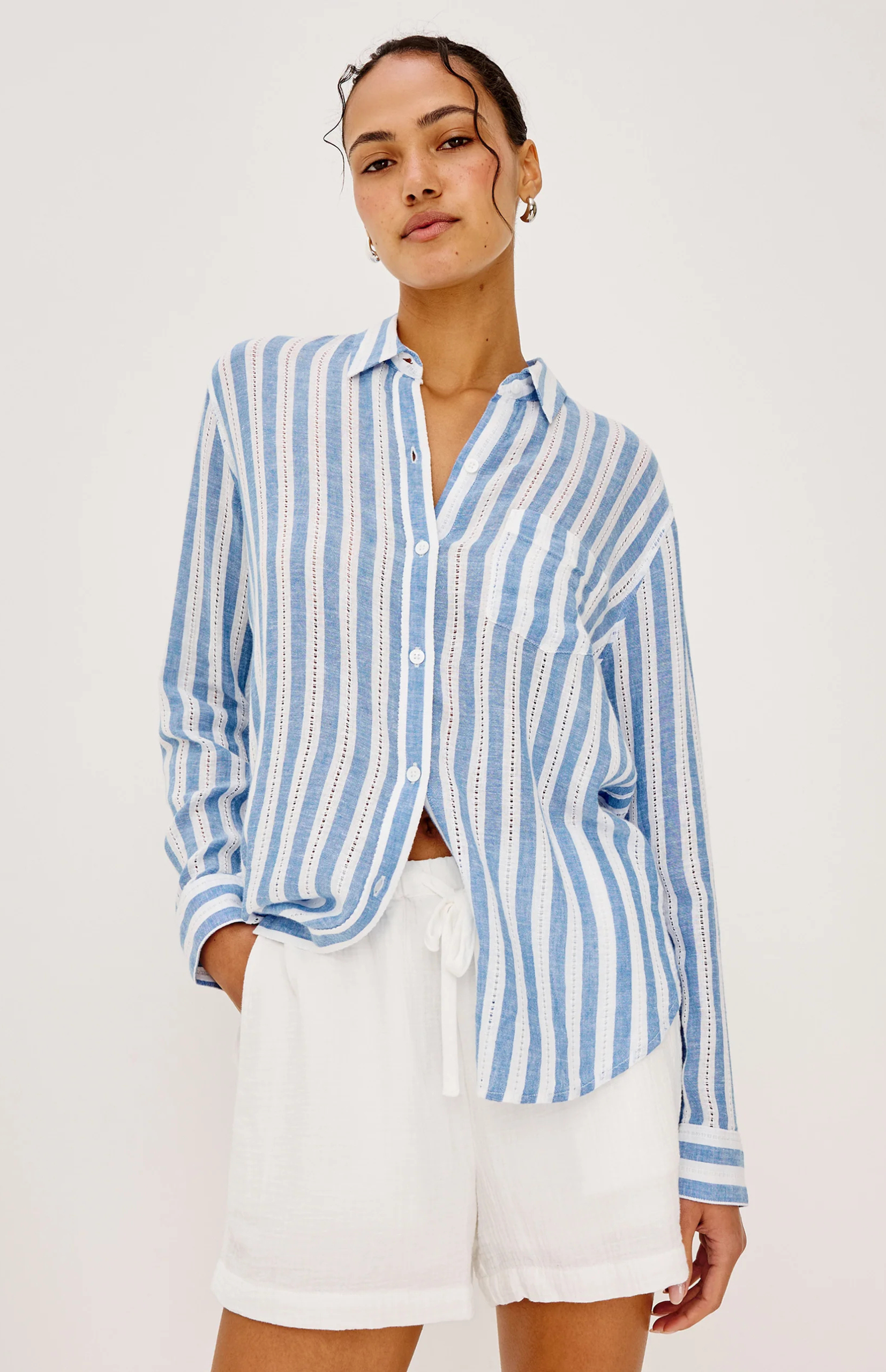 The Cito is a relaxed button-up shirt crafted from luxe linen, featuring a classic collar, chest patch pockets, and cuffed cap sleeves.