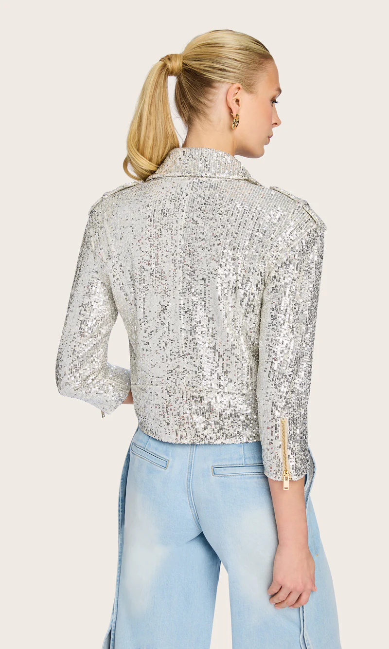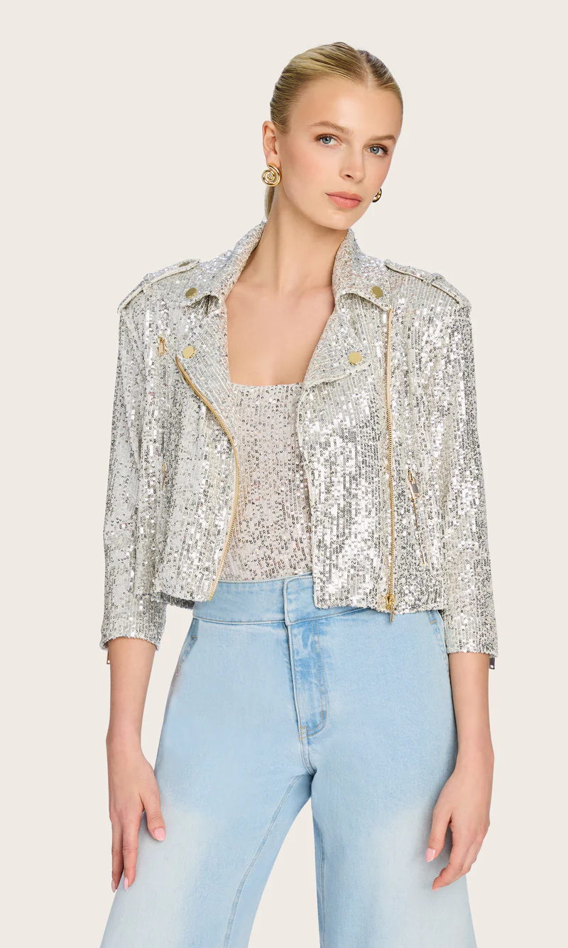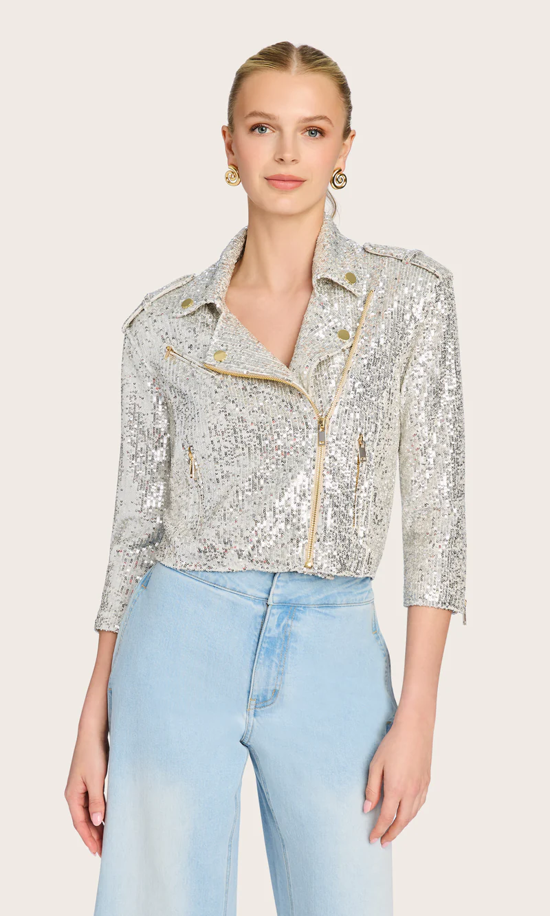 Shimmering sequins and an edgy moto design come together in this cropped jacket with ¾ sleeves. The unexpected contrast creates a striking statement piece that adds texture and attitude to your look.