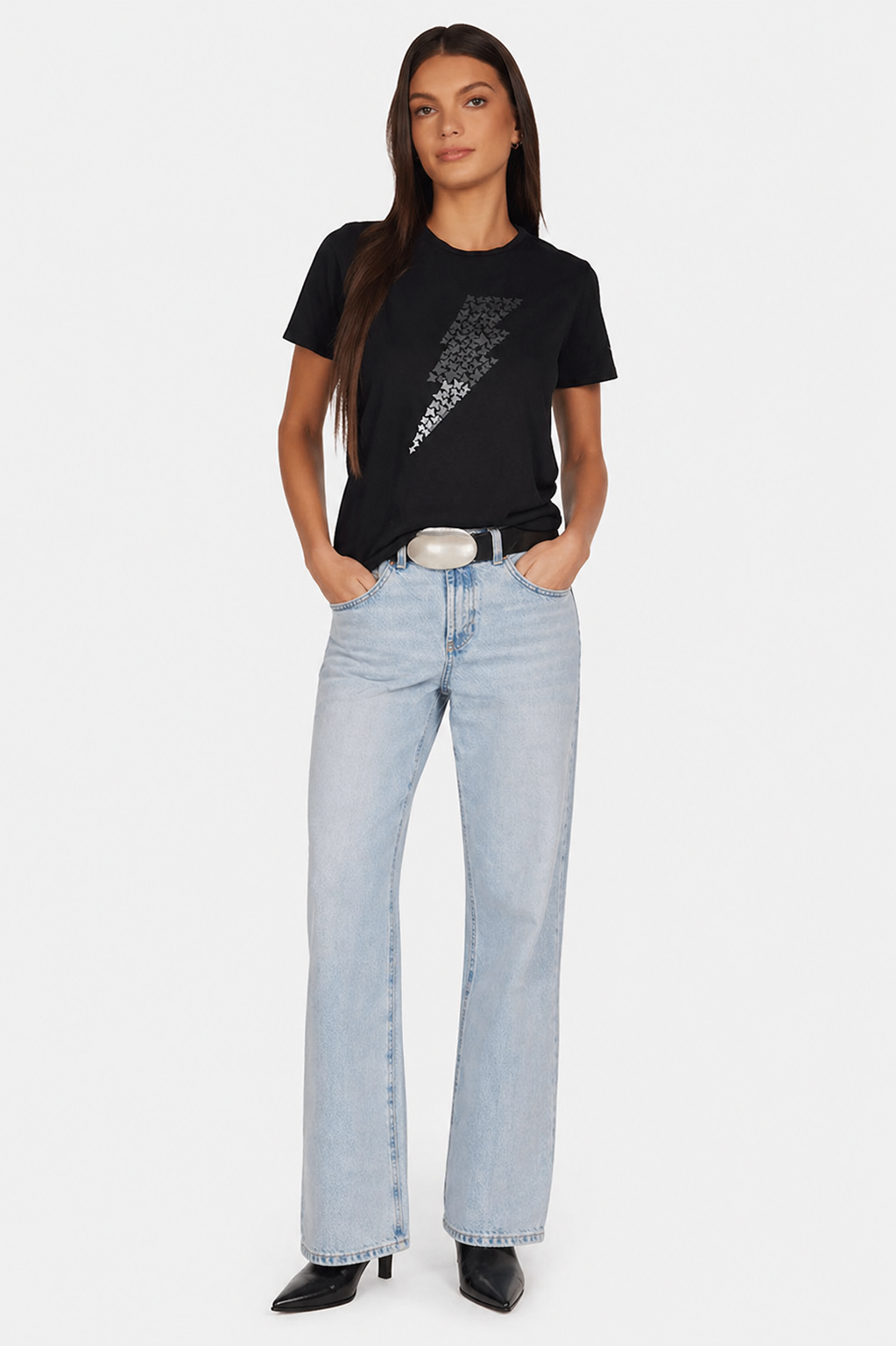 A modern essential with an edge, this short-sleeve tee features a sleek lightning bolt graphic composed of subtle tonal detailing for a refined yet statement look. Designed with a classic crew neckline and a relaxed, easy fit, it offers effortless wearability while maintaining a polished silhouette. The smooth, lightweight fabric drapes comfortably, making it perfect for everyday styling.