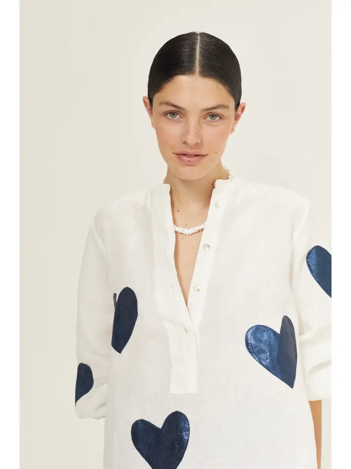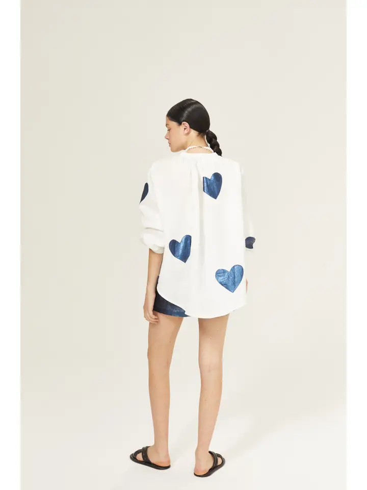 To fall in love with! The oversized Cupid Shirt is super comfy and elegant, featuring a mandarin collar, a hidden button placket, and puffed long sleeves. Crafted with 100% linen fabric, it has heart-shaped foil blue appliques that add a feminine and super fun vibe to this style.