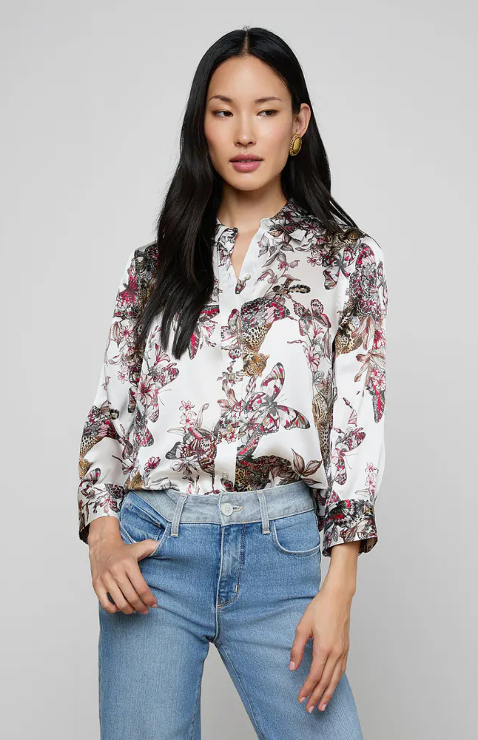 The iconic silk button-down that belongs in every wardrobe. This all-time bestseller is constructed with three-quarter length sleeves designed to perfectly showcase your jewelry—no sleeve rolling required. Our signature Dani blouse is back in a butterfly jungle print.