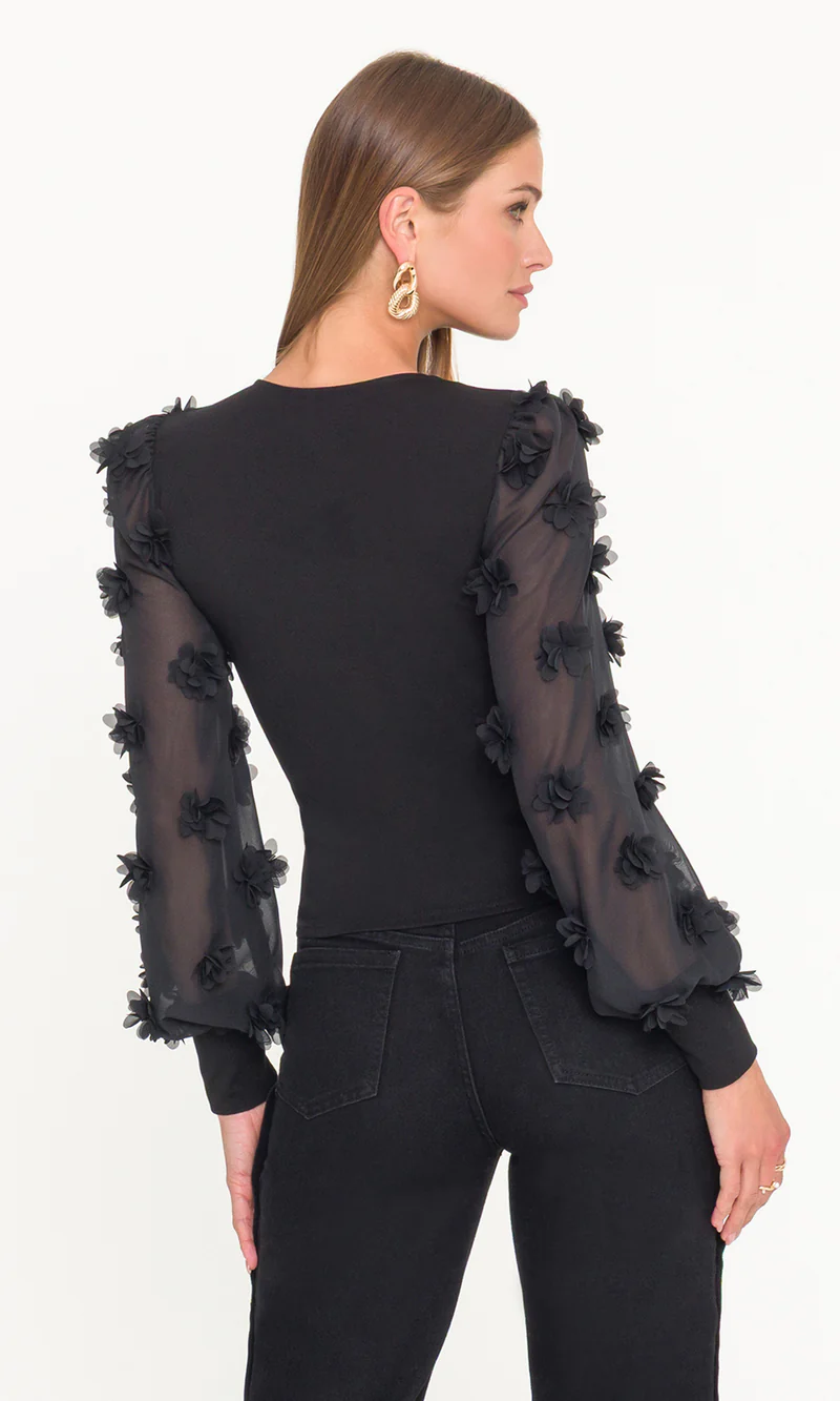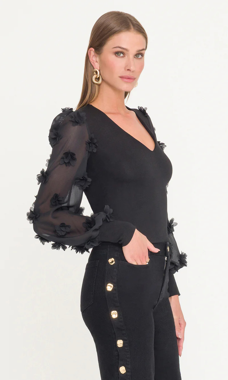 The Darla 3D Floral Georgette Combo Top is where sleek meets romantic. A fitted knit bodice contrasts beautifully with sheer georgette sleeves adorned in dimensional floral appliqués. The V-neckline keeps the look modern, while the textured sleeves add just the right amount of drama. Perfect with jeans for elevated everyday style or paired with tailored pants for a night out.