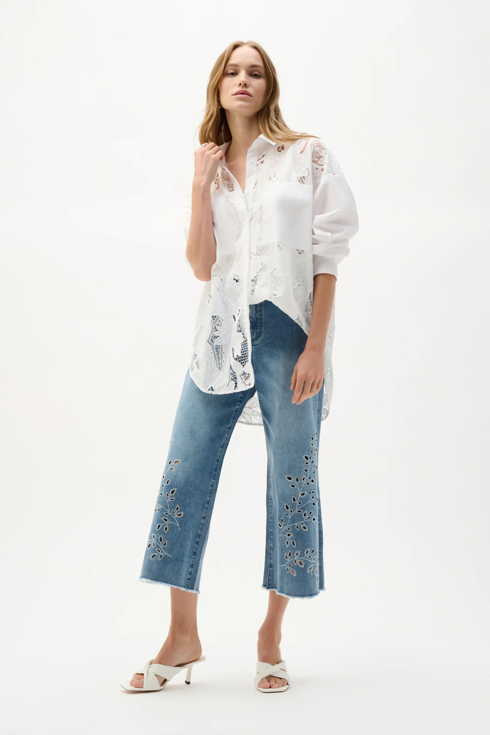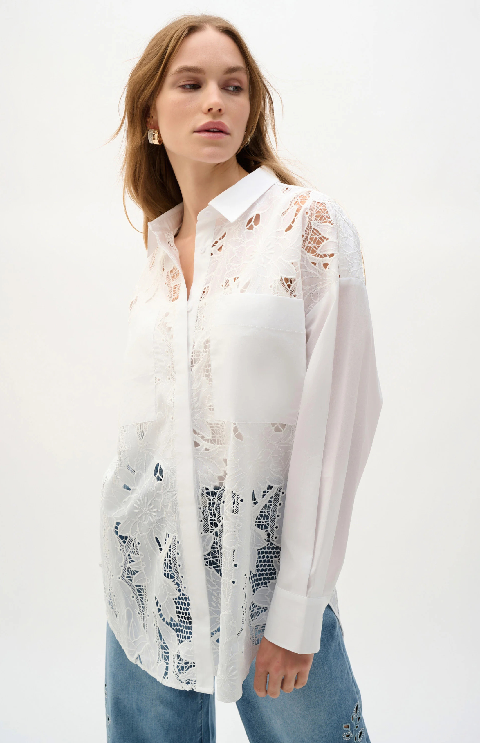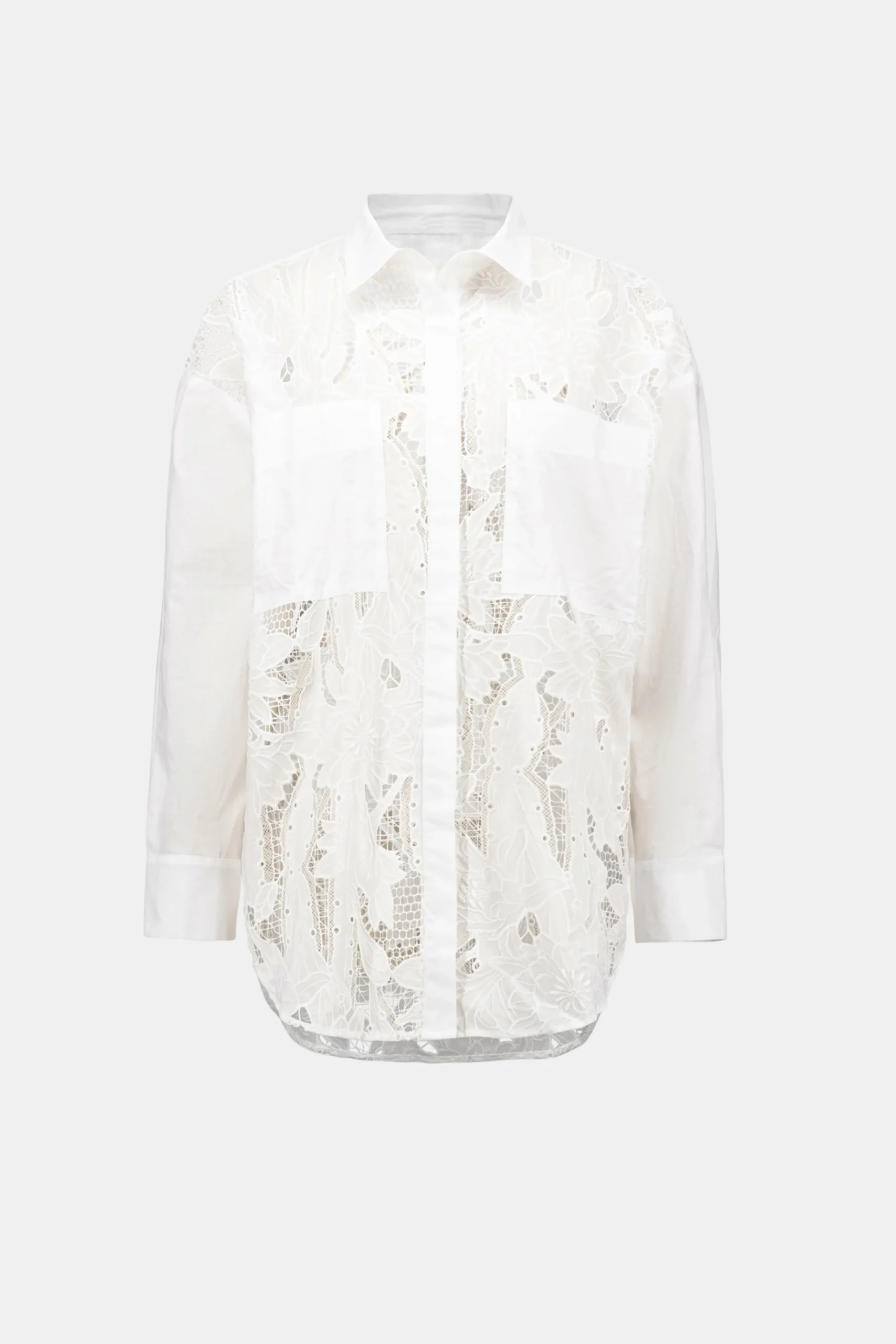 This cotton blouse pairs airy embroidered lace with structured accents at the collar, placket, sleeves, and pockets. Designed in a boxy silhouette, it features a drop shoulder, cuffed sleeves, and a high-low shirttail hem for effortless style.