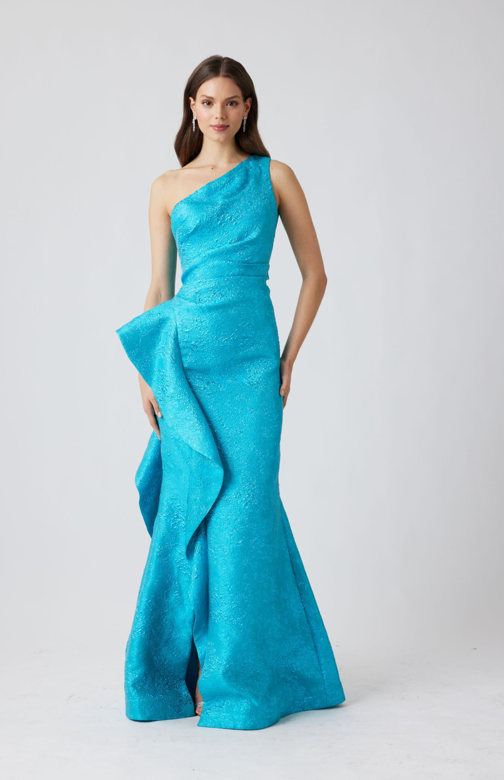 Designed in a bold and beautiful new colorway! This gorgeous one shoulder evening dress will be the center of attention of every room! This dress features a statement side ruffle and ruching along the bodice that hugs the figure in all the right ways. The hot pink jacquard fabric with metallic detail elevates the entire look and transitions this dress from day to night. Accessorize with black heels and diamond earrings.
