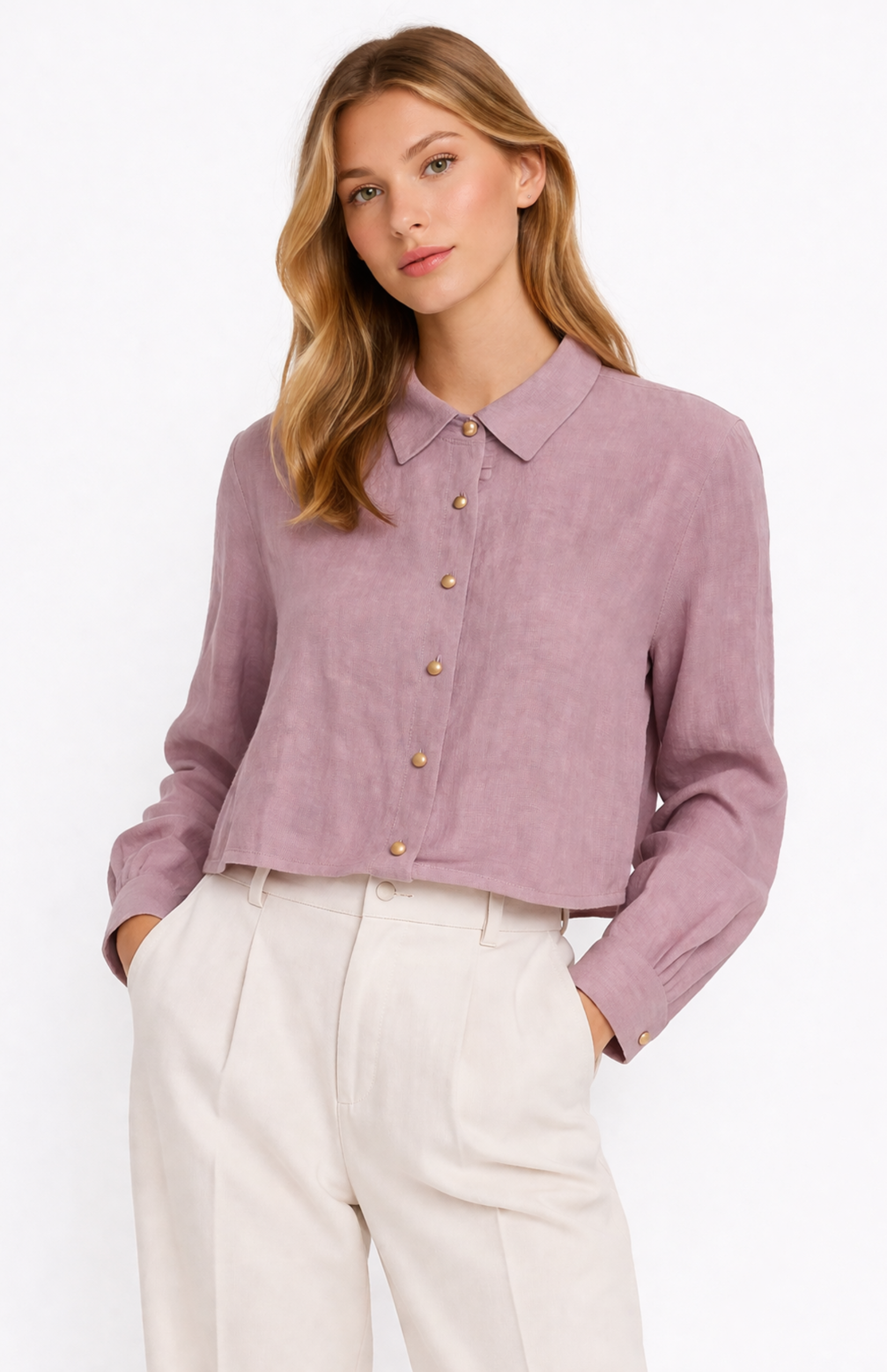Effortlessly refined with a relaxed, modern silhouette, this linen blouse is a timeless addition to any wardrobe. Crafted from a lightweight, breathable fabric, it offers an easy drape with a softly structured shape. The classic collar and full button-front—finished with subtle gold-tone buttons—add a polished touch, while the slightly cropped length pairs beautifully with high-waisted trousers or skirts.