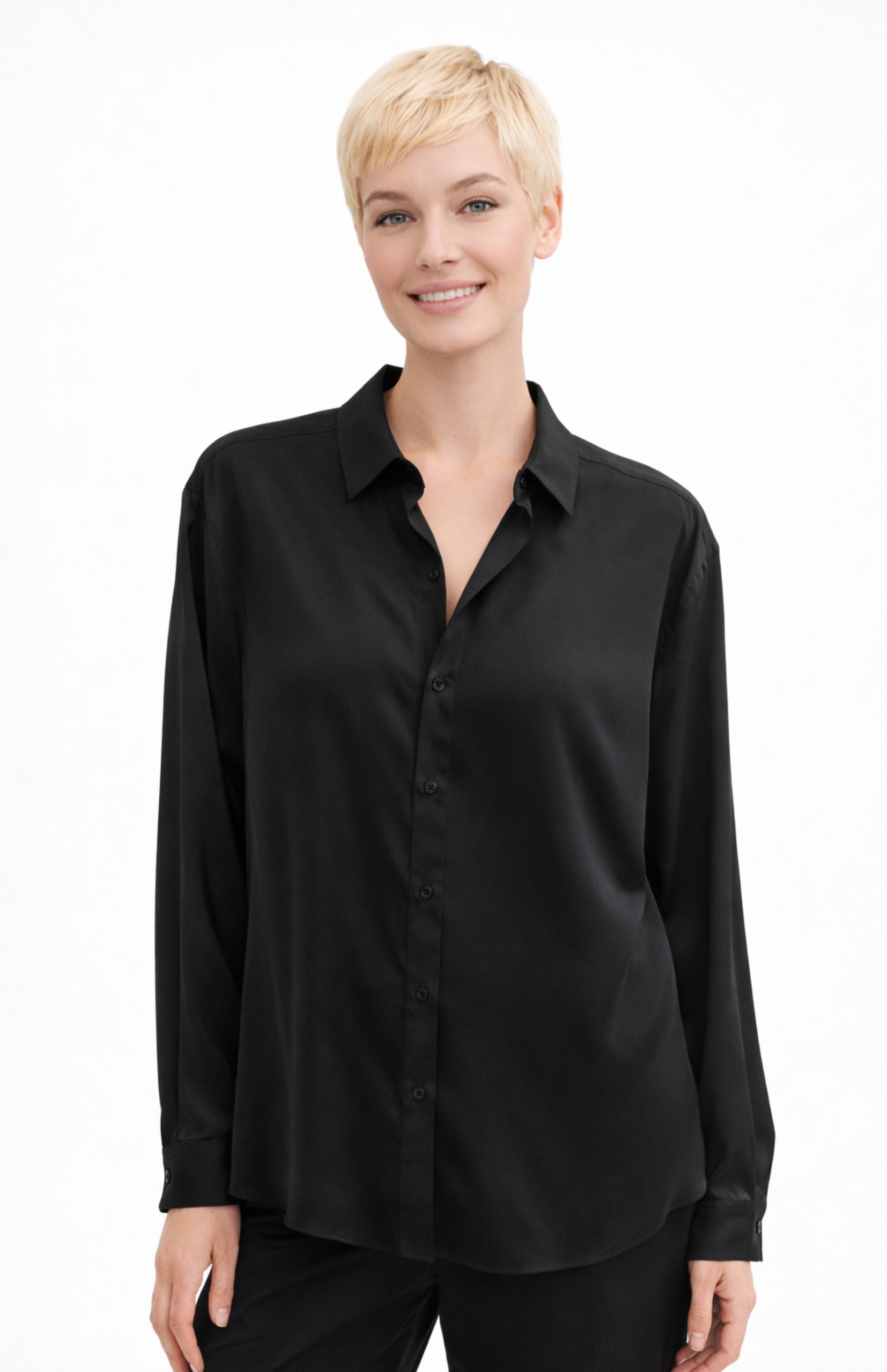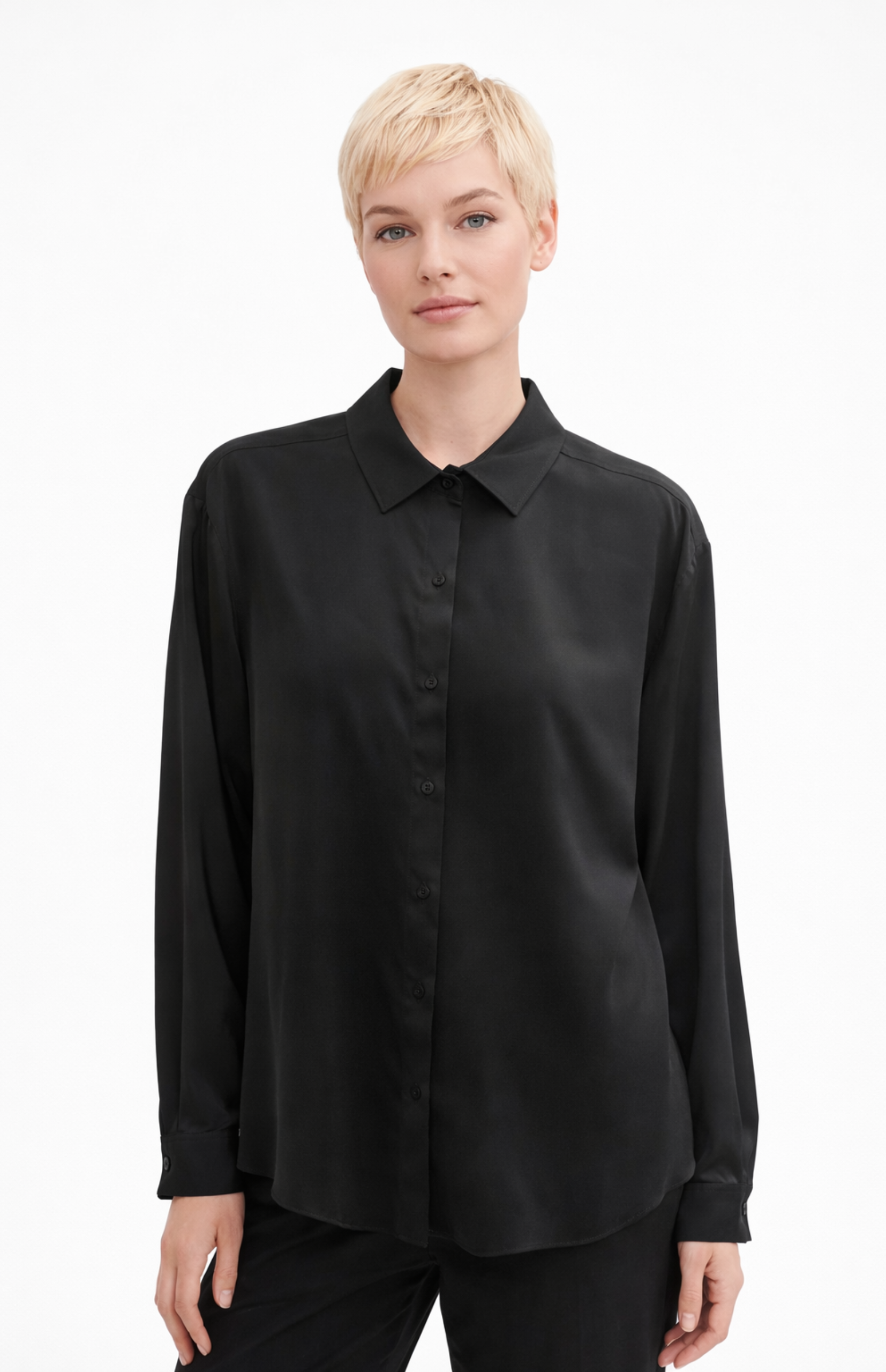 Elevate your wardrobe with this effortlessly refined silk blouse, crafted from 100% silk for a luxuriously soft, fluid drape. Designed with a relaxed silhouette, it features a classic pointed collar, concealed button front, and subtle sheen that catches the light beautifully. The lightweight fabric feels smooth against the skin, offering both comfort and sophistication—perfect for day-to-night dressing. Style it tucked into tailored pants or worn loose for an understated, polished look.