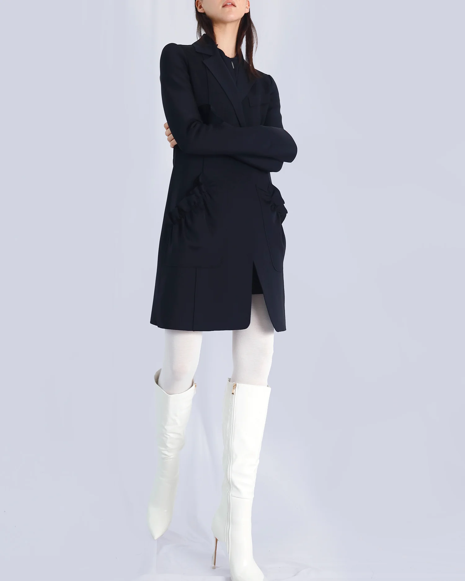 A refined outerwear piece balancing classic tailoring with creative detail