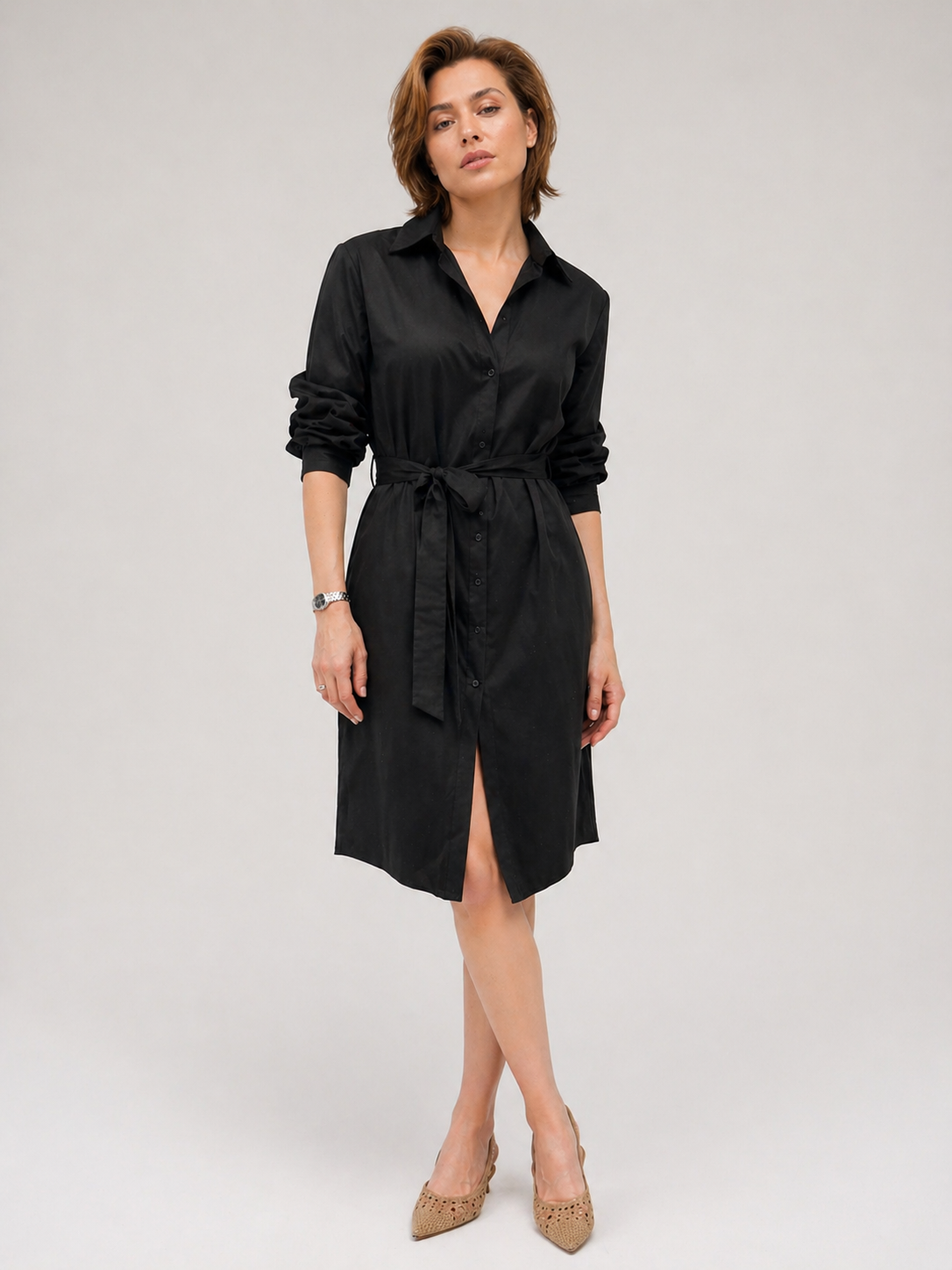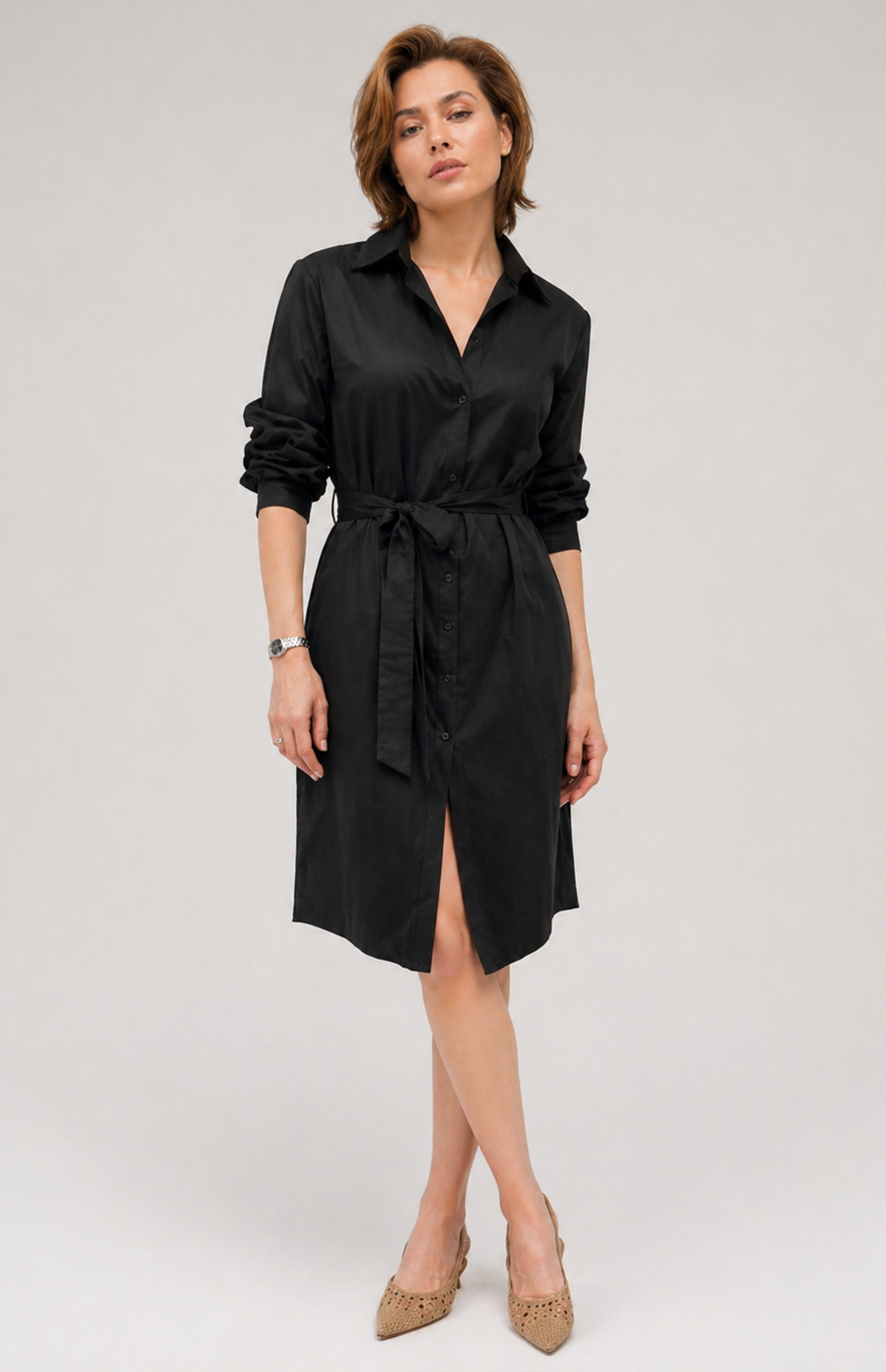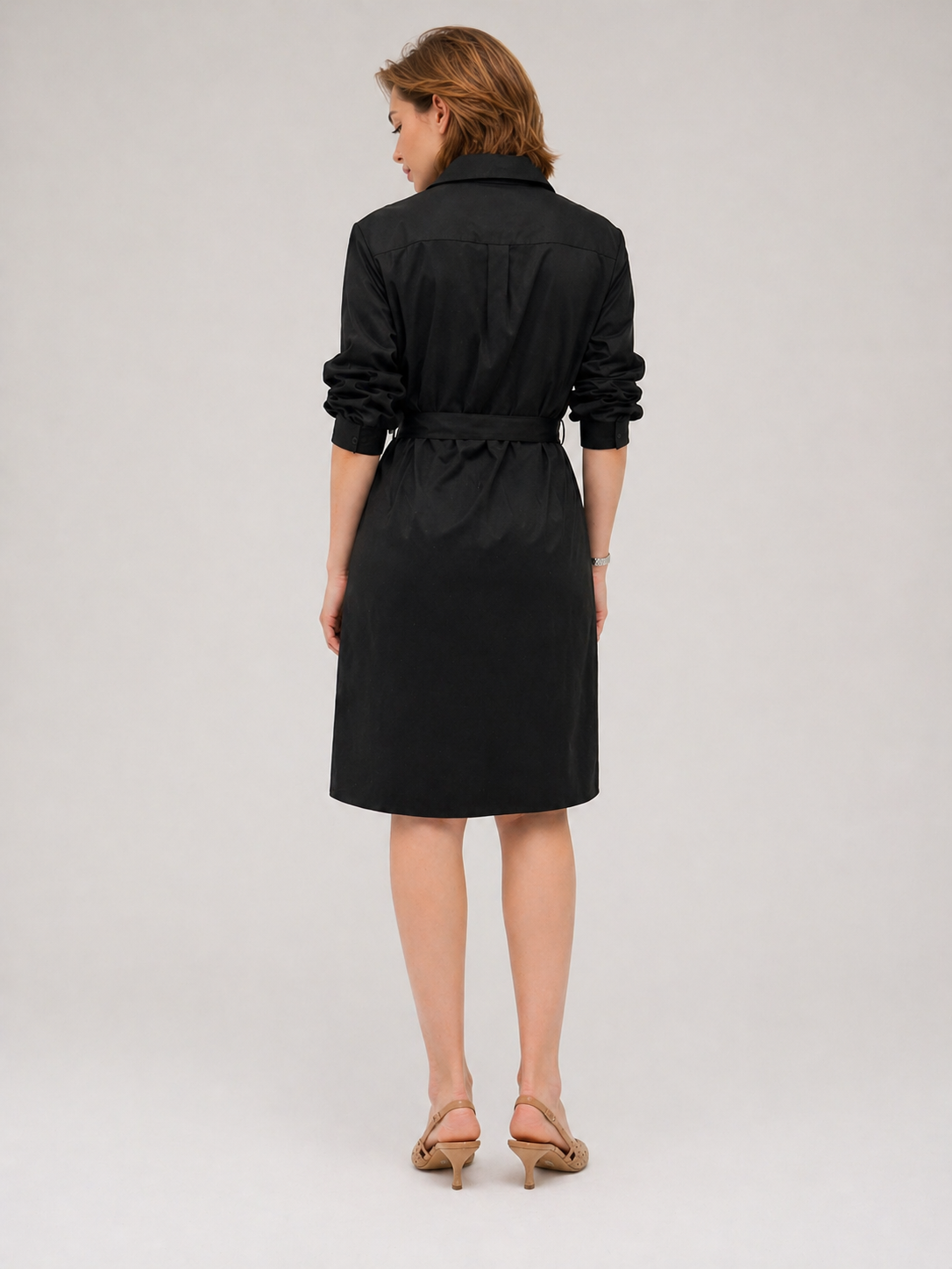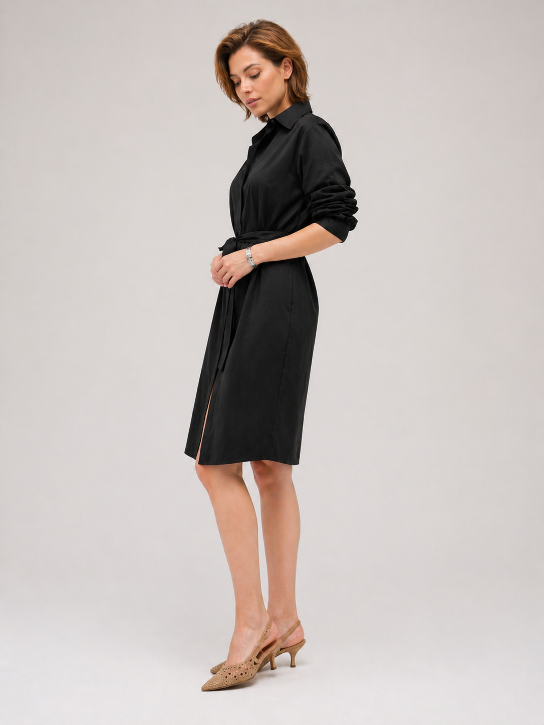A refined and versatile piece, this dress features elegant 3/4 length sleeves with subtle ruched detailing for a touch of texture and sophistication. Designed to flatter, the silhouette is clean and streamlined, making it perfect for both daytime wear and evening occasions.