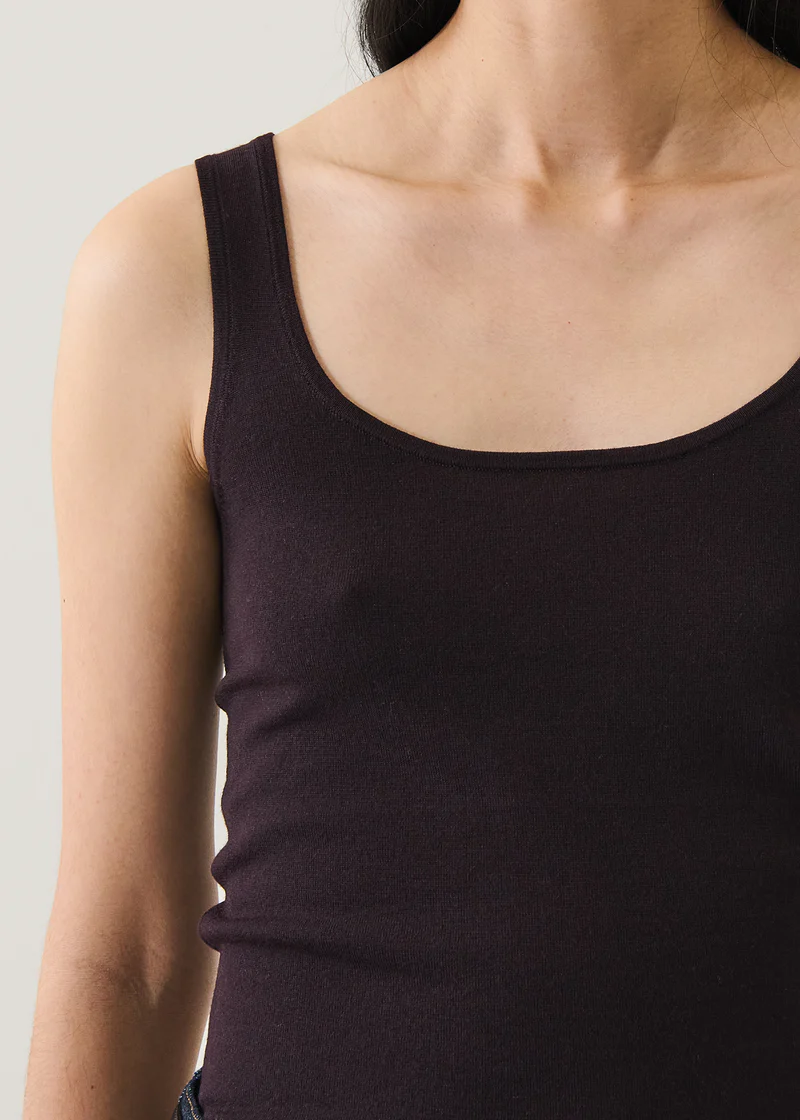 Our luxury fitted tank is knit in an extra-fine 16 gauge merino stretch yarn. This piece is cut in a slim fit and features a flattering scooped neckline. This piece is ideal layered under our superfine merino stretch fitted cardigan or your favourite blazer.