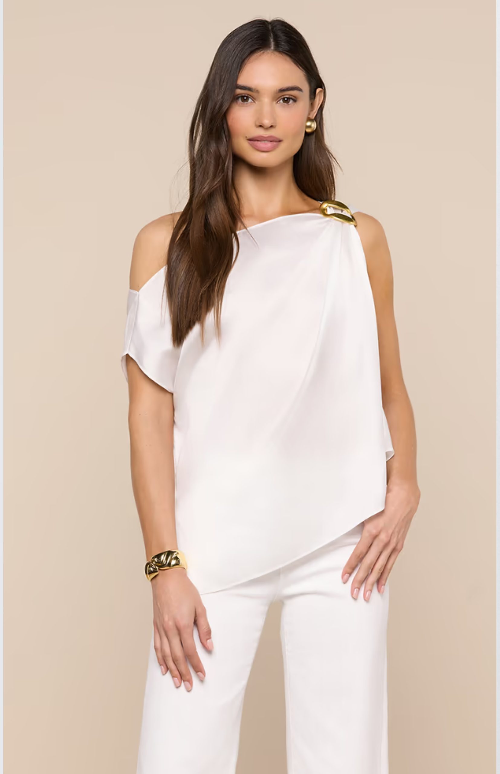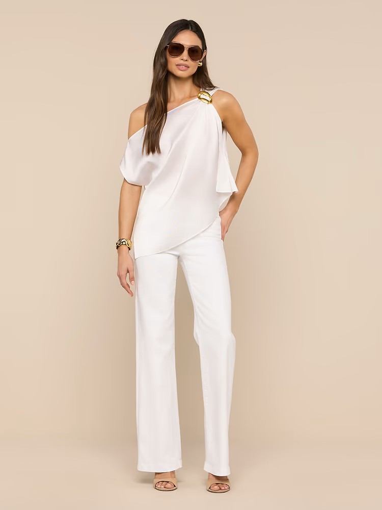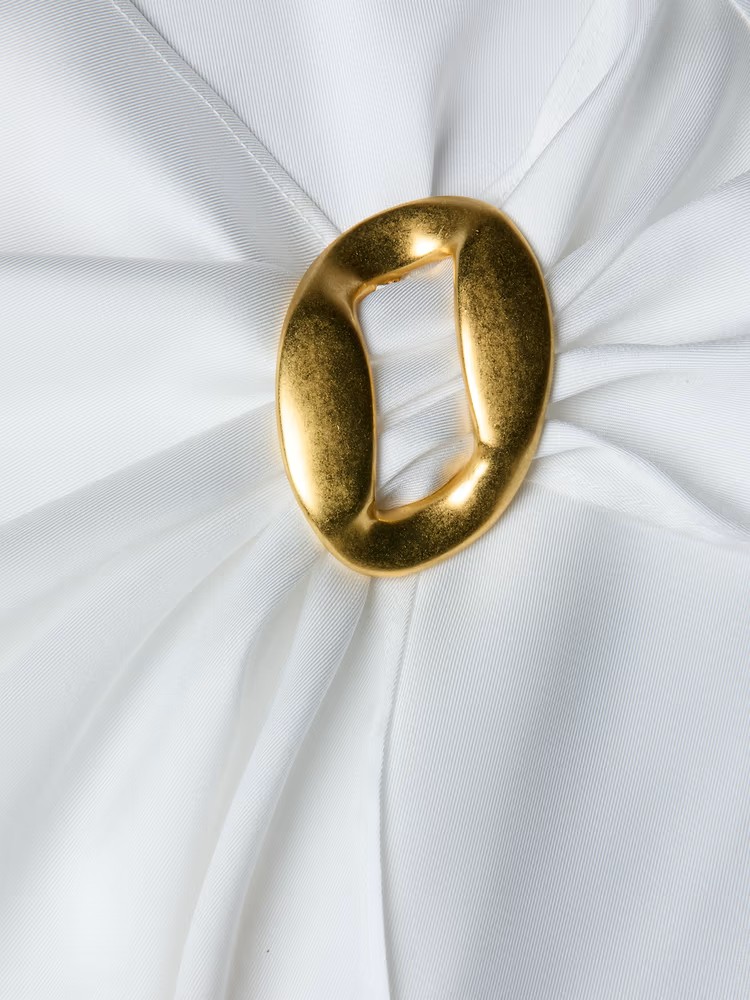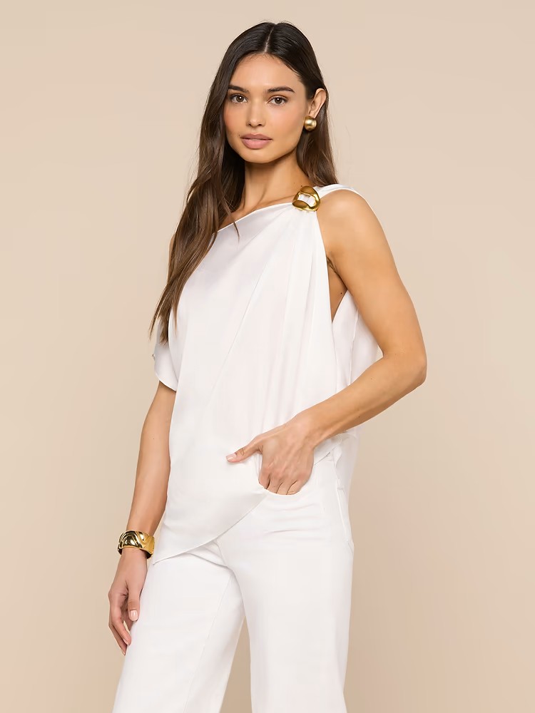 The elegance of this scarf top lies in the effortless drape. Featuring a subtle print and buckle accent, the Driselle melds wearability with glamour.