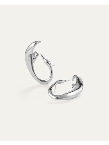 Sculptural and elegant, the Egret Earrings are a bold statement in refined design. Crafted in polished silver-tone metal, these earrings feature a fluid, curved silhouette inspired by the graceful neck of an egret in motion. Their distinctive open loop hugs the earlobe in a unique and artful way, blending modern minimalism with organic form. Lightweight yet impactful, they are the perfect accessory to elevate both everyday and evening looks.