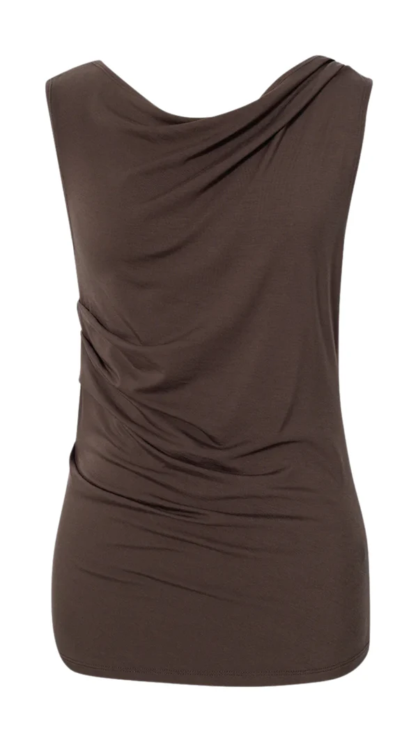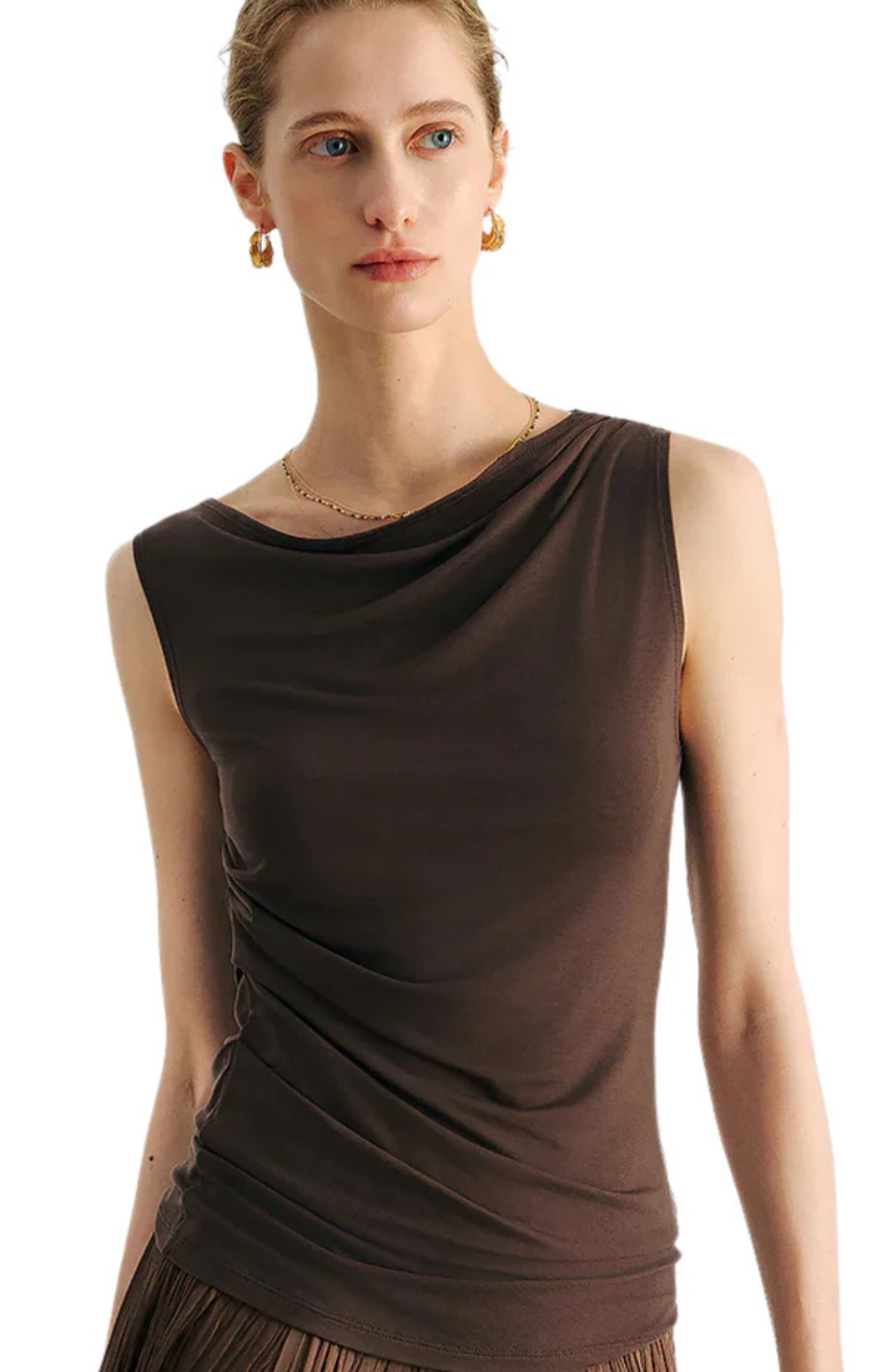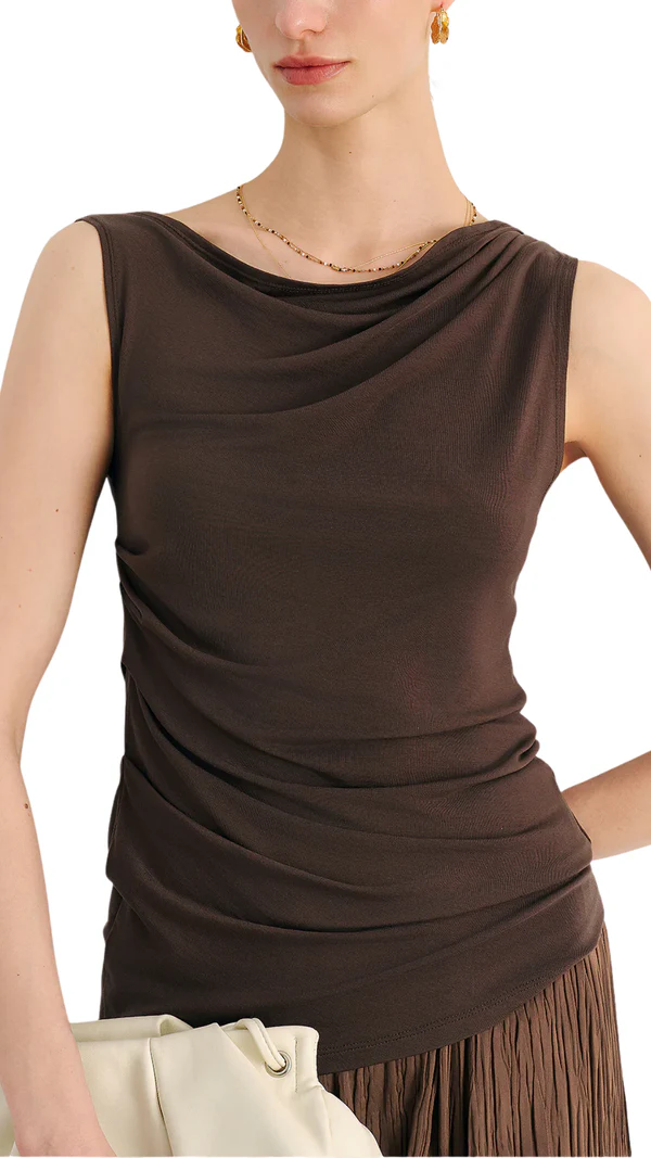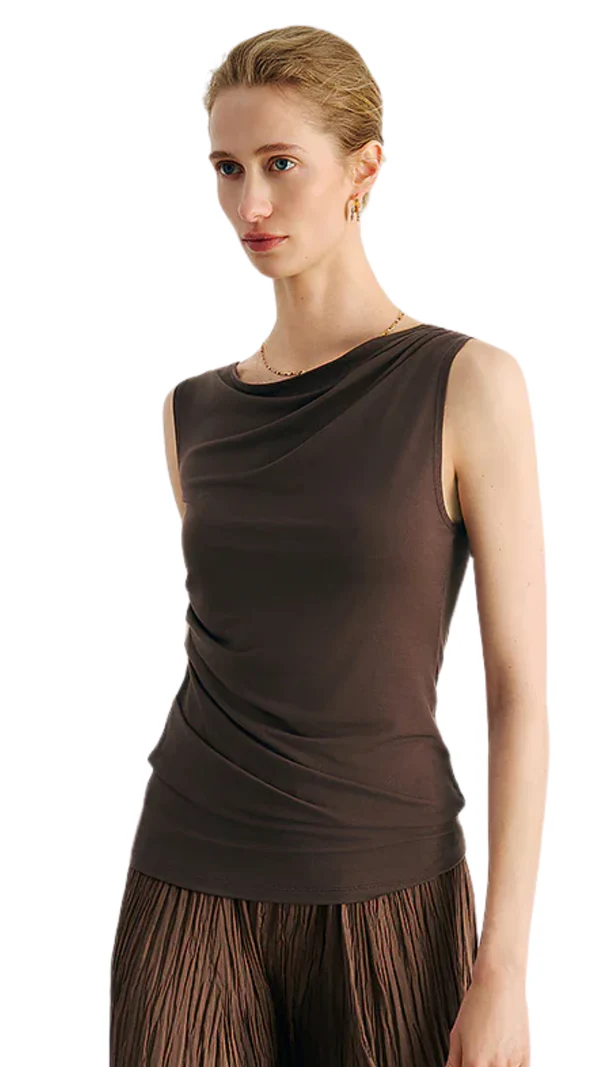 This rich brown ruched top in sustainable hugs your frame with subtle stretch. A high neckline and sculpted seams elevate its silhouette. Ideal for layering or styling solo—pair it with high-rise trousers or midi skirts for a sleek, put-together edge.