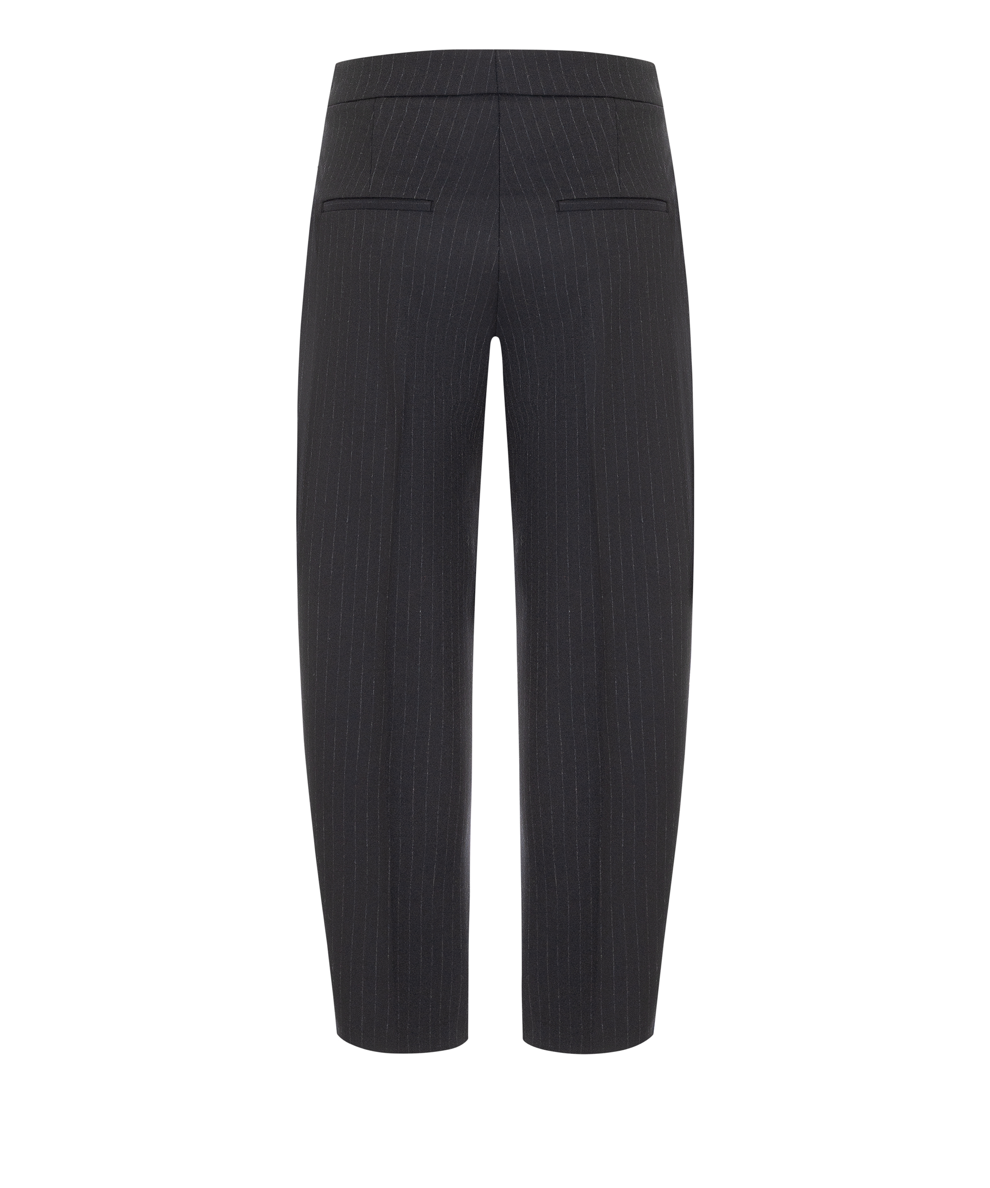 Elaine is an ankle-length suit trouser with a barrel fit and pinstripes. The model is made of a high-quality wool substitute fabric that gives a structured and neat expression. The trousers have press pleats and an integrated belt that emphasize the classic, stylish design. The slightly curved shape – a carrot shape with more volume over the hips and tapered legs – creates a modern and flattering silhouette. True to size.