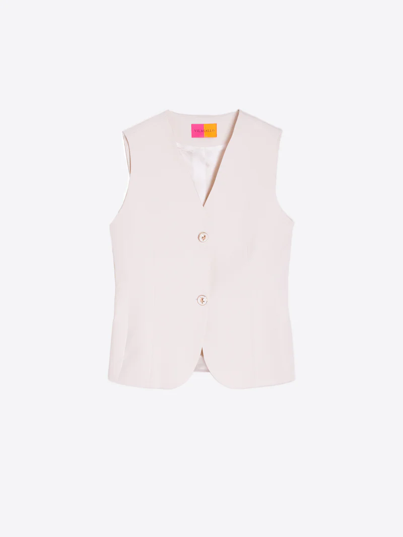 The CHALECO ELEANOR white crepe vest is expertly designed with a sleek, professional appearance. Made from high-quality crepe material, it offers a sophisticated style and is perfect for any business or formal occasion. With its elegant design and comfortable fit, this vest is a must-have addition to any wardrobe.
