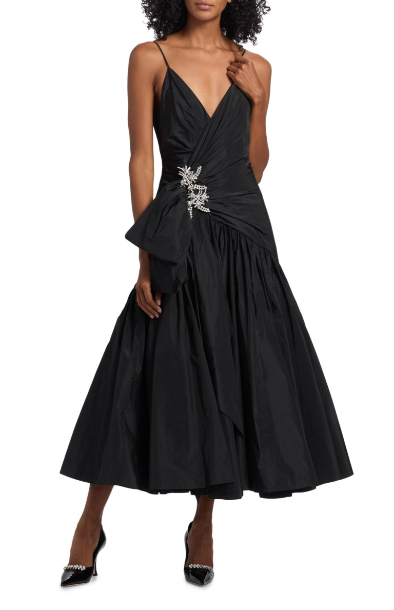 Ellett midi-dress is crafted of structured tafetta in a drop-waist silhouette, accentuated by rhinestone embellishments at the waist.