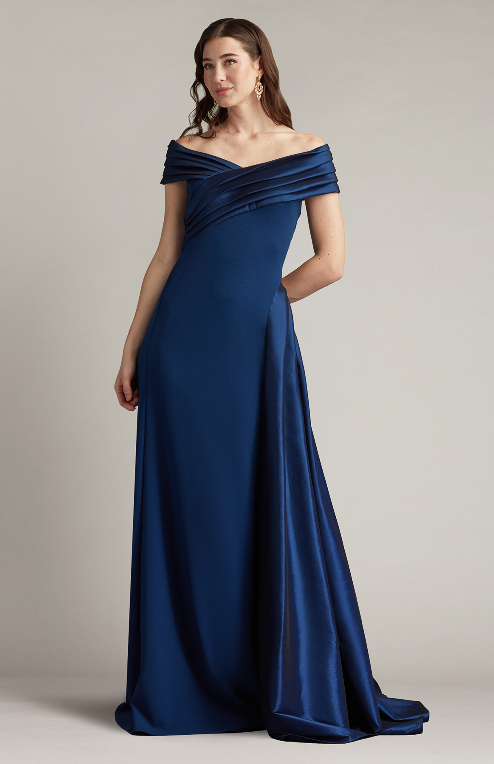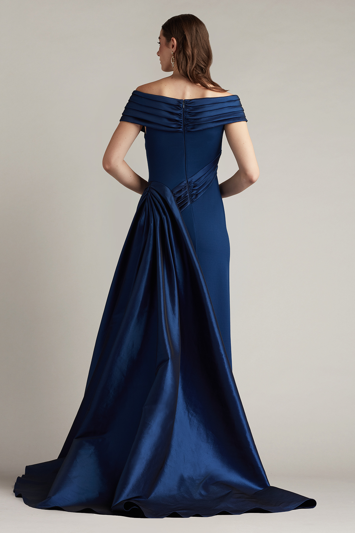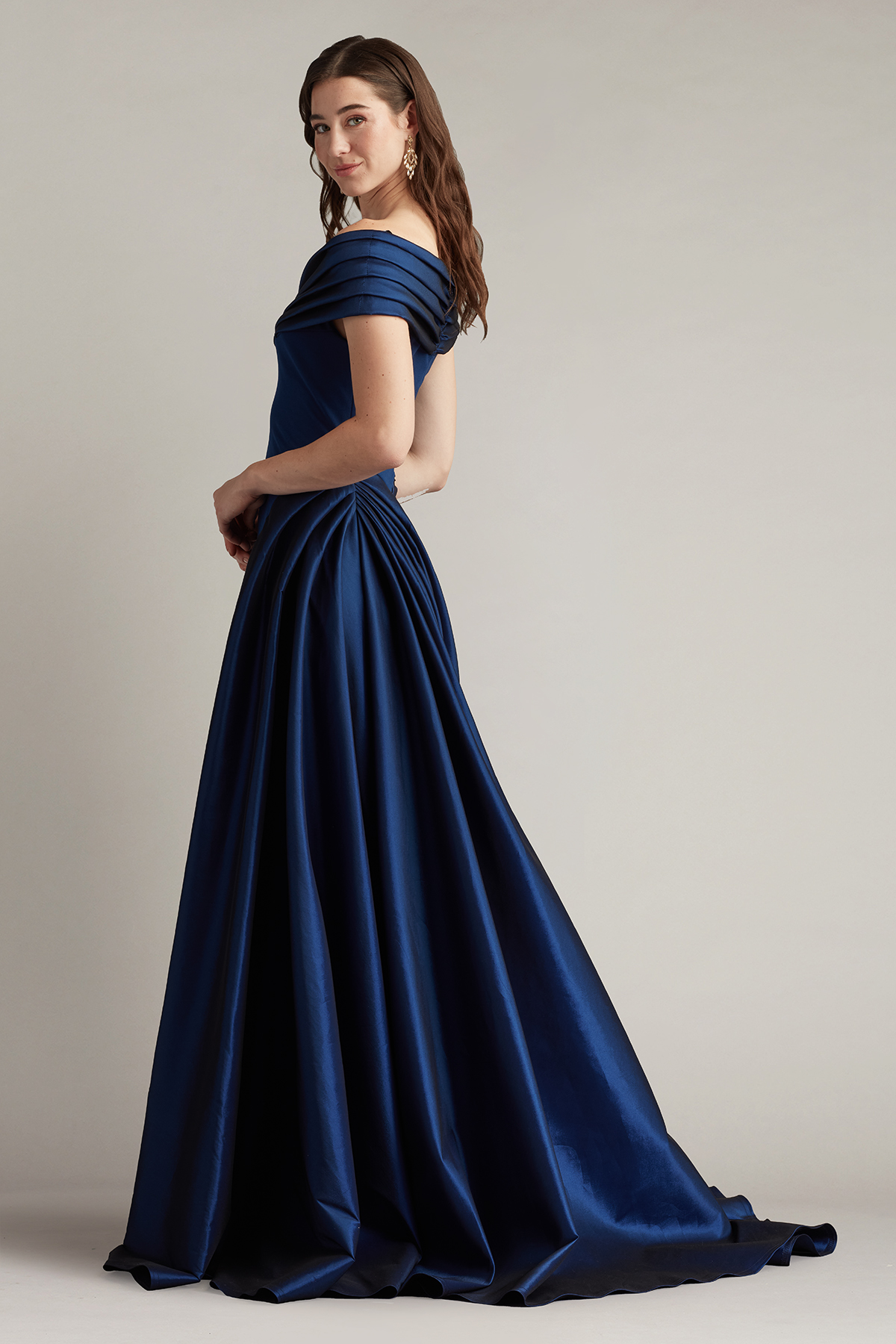 This stunning crepe gown exudes timeless sophistication with its V-neckline, full-length skirt, and exquisite detailing. An off-shoulder pleated portrait collar frames the neckline with refined elegance, while an asymmetric draped overlay taffeta train cascades gracefully from the back, adding dramatic flair. Crafted with exceptional craftsmanship and luxurious fabric, it promises to elevate any formal occasion. Center back invisible zipper.