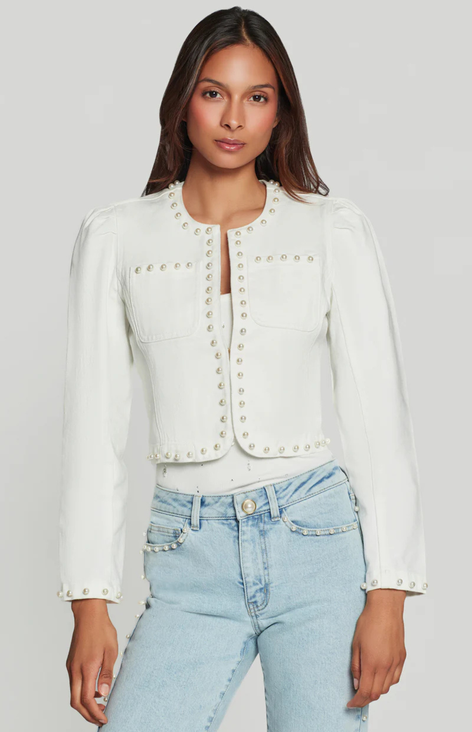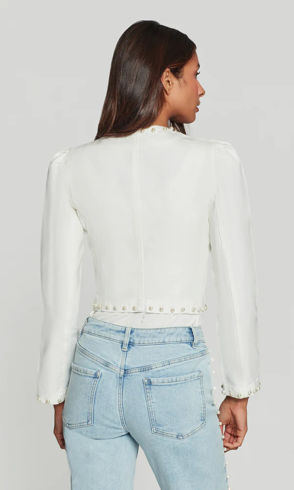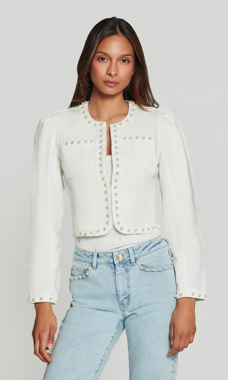 Add a touch of polish to classic denim with the Emilie Pearl Denim Jacket. Featuring pearl-trim detailing, front patch pockets, and a clean, collarless neckline, this jacket elevates any look. The perfect mix of feminine and modern, Emilie pairs effortlessly with denim or tailored separates.