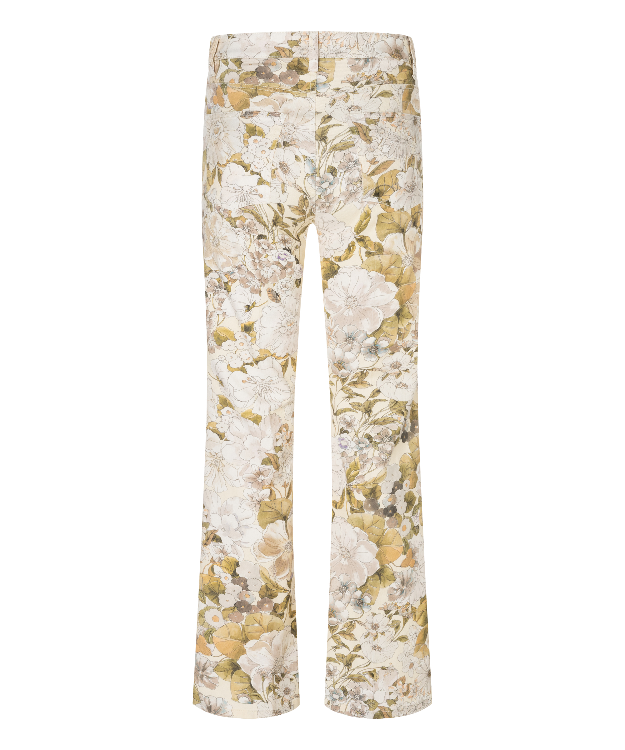 featuring a refined floral print in soft shades of olive green and taupe on a vanilla background. Just below the waistband, two decorative flap pockets add a playful and feminine detail. A pressed crease along the center of the legs enhances the elegant, streamlined silhouette. These exclusive designer jeans can be washed at 30 degrees.